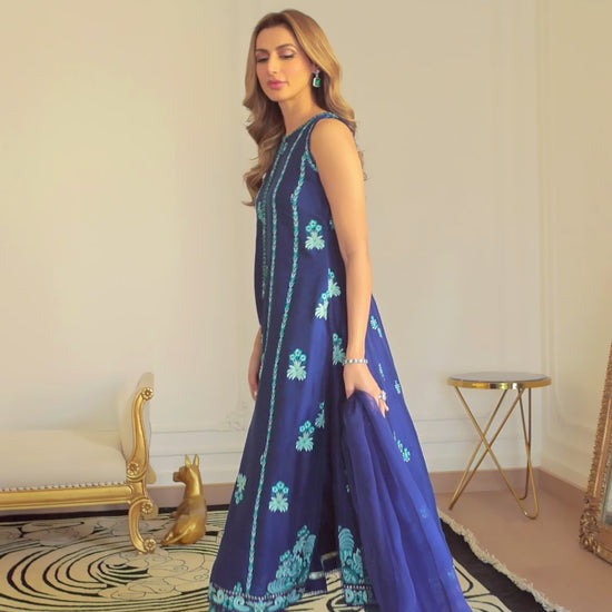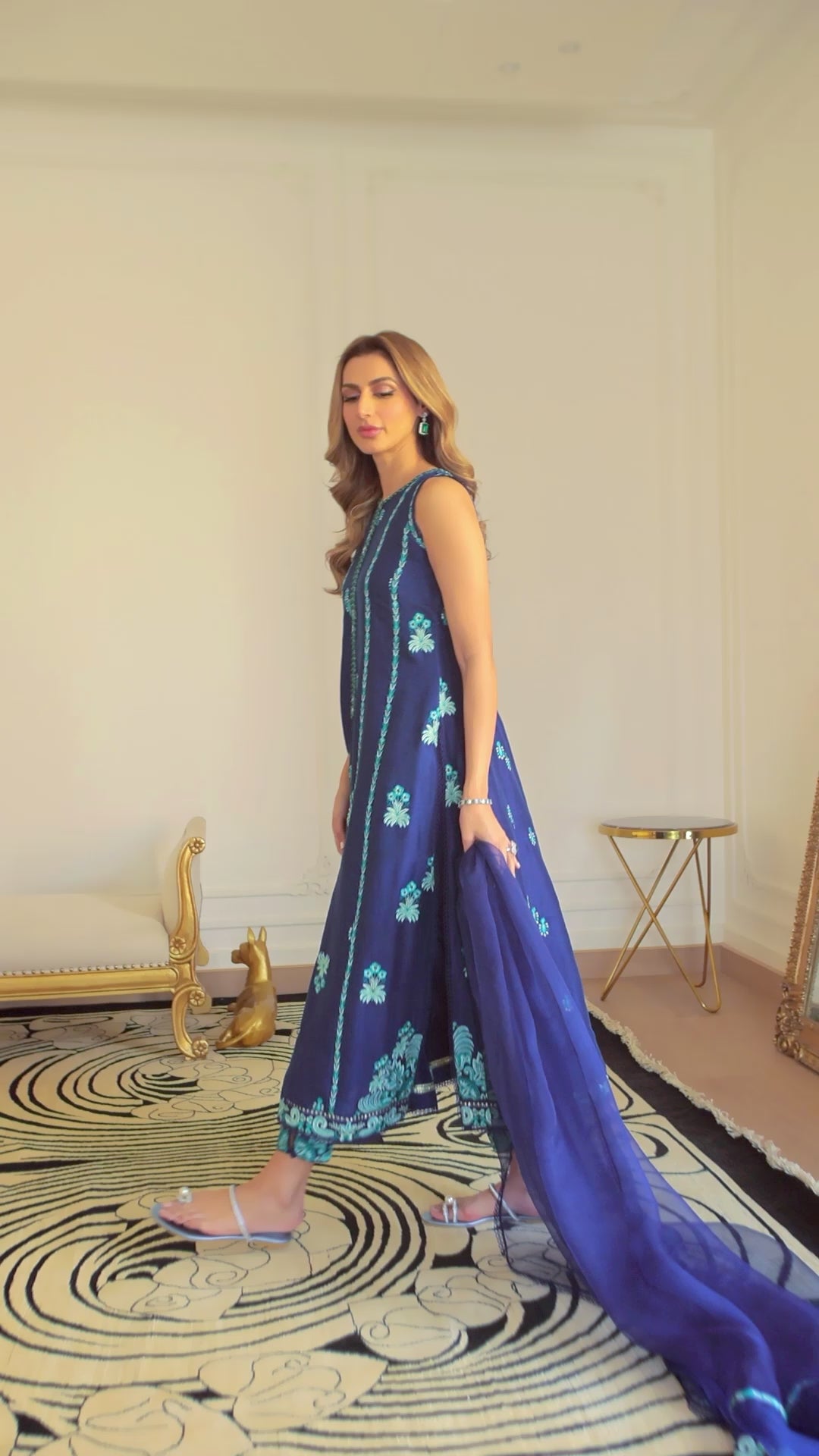 This gorgeous royal blue five paneled shirt is beautifully embroidered with the most fantastical botanical motifs and is a true statement piece of this season. The raw silk paneled shirt features a beautiful close round neckline with the most vibrant flattering embroidered heavenly motifs, floral bunches and borders that run throughout the hem of the shirt. Embellished with sequins and cut dana details, it is paired with beautifully embroidered raw silk pants. To complete this outfit there is a coordinating same color organza dupatta that is finished with floral embroidered border on all four sides and can be styled with classic emerald earrings in order to create a look that is truly unforgettable.