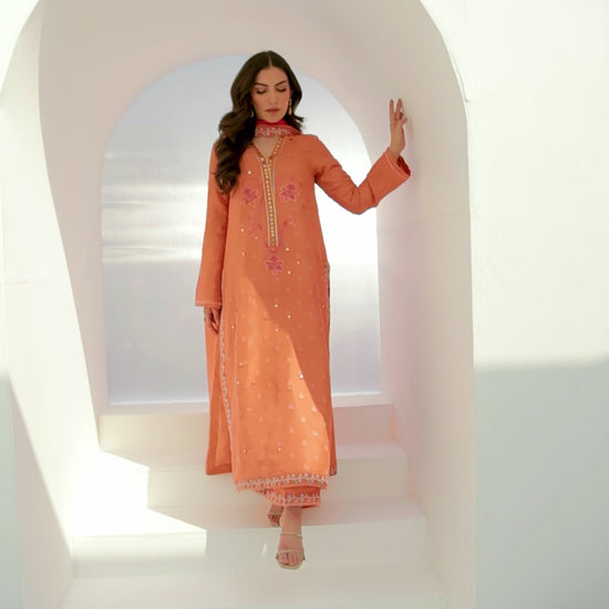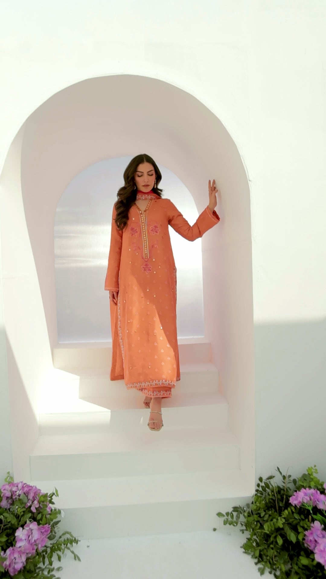 A fresh coral hue is richly embroidered with silk thread work in tonal salmon pink hues and while the universally flattering neckline is adorned with glimmering gold kaam daani. Delicate embroidered motifs add the perfect amount of glamour.