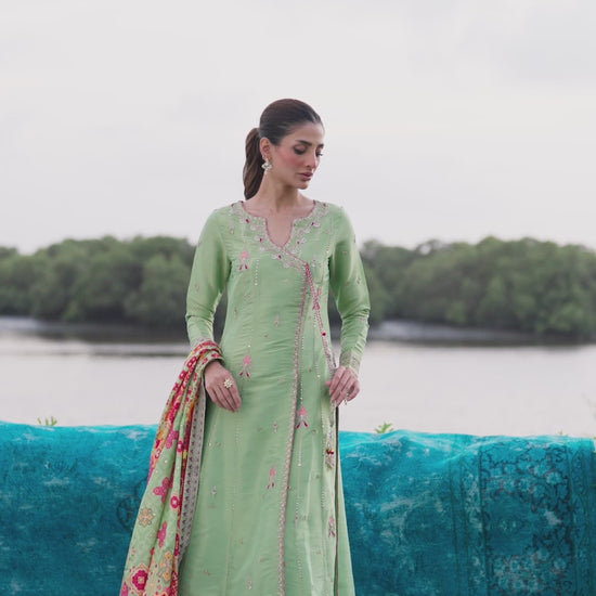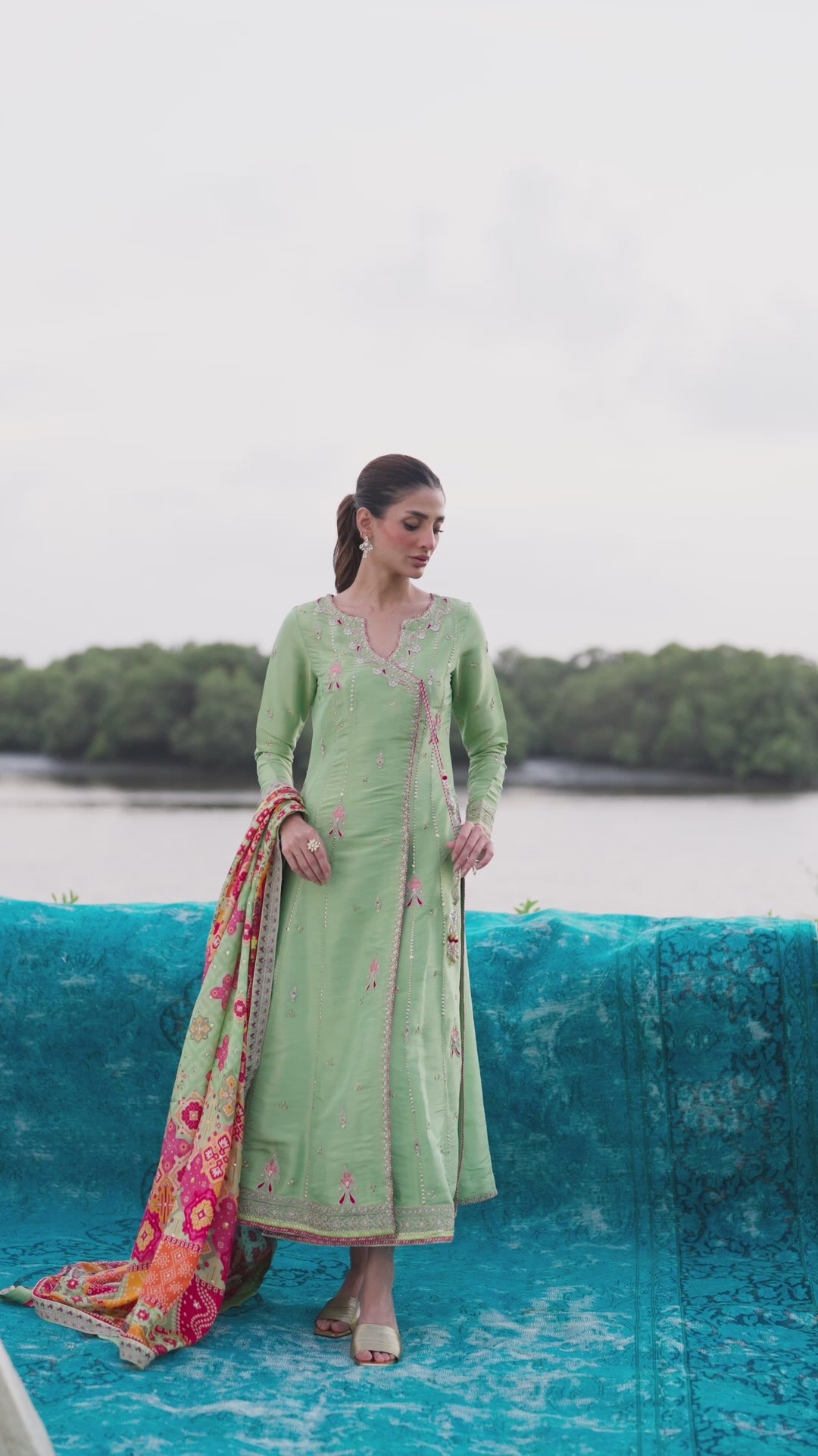 An ode to timeless elegance — this pure zari silk angarkha in a striking green hue is adorned with exquisite handwork and intricate embroidery. The silhouette flows gracefully, finished with beautifully printed borders that add a touch of modern artistry. Paired with straight pants for a sleek, balanced look and a printed dupatta delicately embellished to perfection, this ensemble captures effortless sophistication with a festive charm.