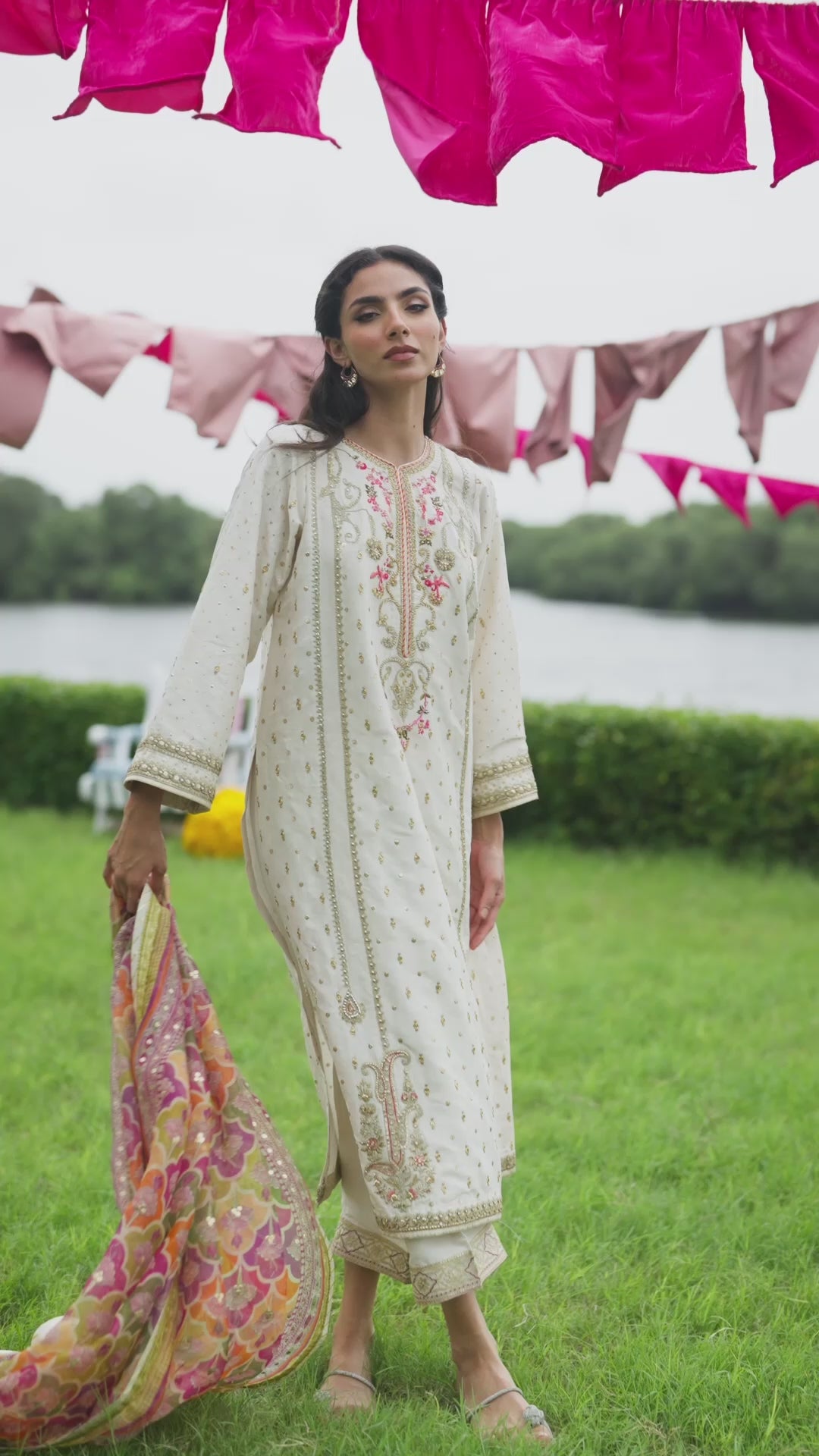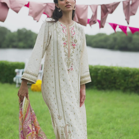 Radiating warmth and festive allure, this pristine ivory ensemble shimmers with that irresistible pure raw silk sheen. Meticulously hand-embellished with zardozi, sequins, Swarovski crystals, and silk threadwork in delicate pink and green—creating a joyous play of color and texture. The round neckline and kurta silhouette exude timeless sophistication, while the embroidered sleeves and intricate borders add finesse. Paired with a gorgeous pure organza dupatta with a striking digital print in a myriad of colours, this look is designed to dazzle. Style it with sleek hair and bold earrings for an unforgettable statement.