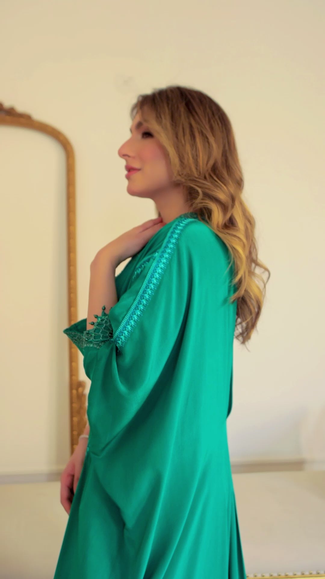 Step into the limelight in this absolutely striking emerald kaftan that is truly the most sought-after silhouette of the season. The breathable crepe allows you to carry this style with ease letting it shape your body in the most flattering manner. The scallop cut-work neckline and sleeves are meticulously worked with hand embellishment and stone detailing that carries all way the way to the slits and the hem, adding a gorgeous symmetry and grace to the entire outfit. This statement piece with its flawless tailoring will have you looking like a true sight to behold on any given occasion.