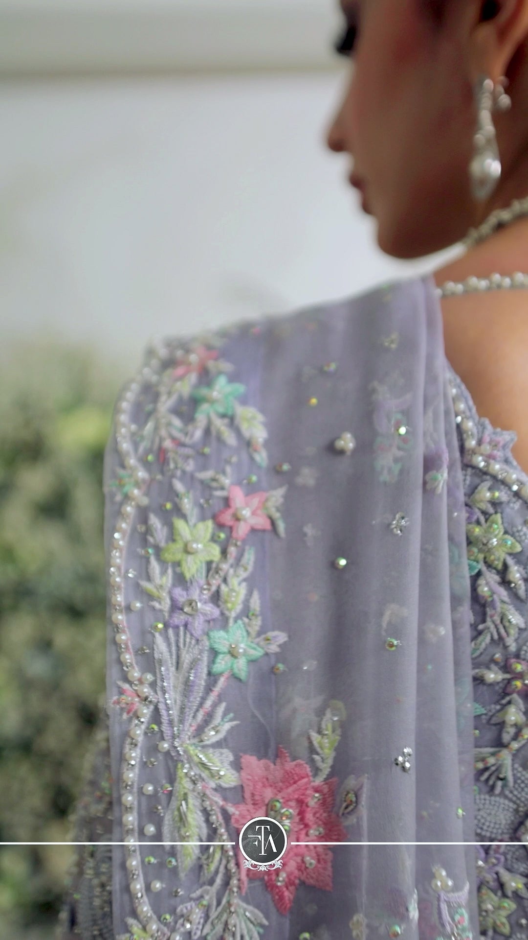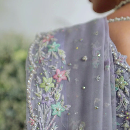 A dramatic jacket cut from pure periwinkle organza, hand embellished with pearls, kora, dabka, Swarovski crystals, pure silk thread work and Swarovski crystals.