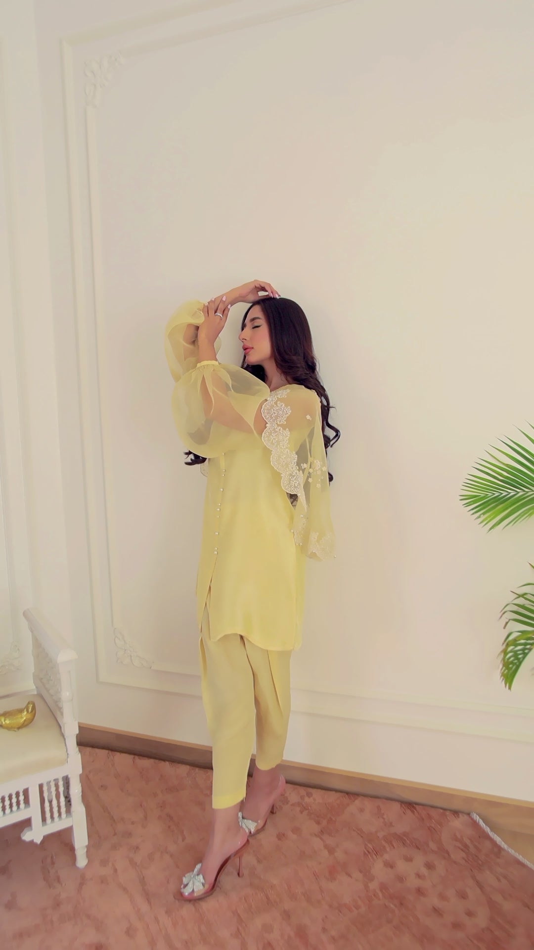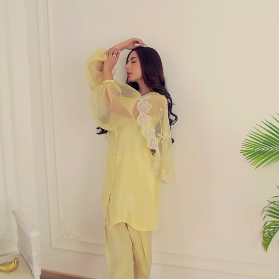 This elegant cape shirt silhouette is the look we have all been dreaming of this spring. The raw silk short shirt is gorgeously tailored with a scallop satin hem and a voluminous balloon sleeve that effortless creates a beautiful fall and drape. The canvas of refreshing pastel yellow colored shirt is attached to the most mesmerizing organza cape that features a beautiful flair and is worked generously with pearl and sequence embellishments. The scallop borders and the 3D floral bunches of the cape are adorned with hand worked detailing that instantly uplifts the entire silhouette. Paired with a tailored pant on breathable crepe, this look truly embodies a woman that is one with the world of fashion.