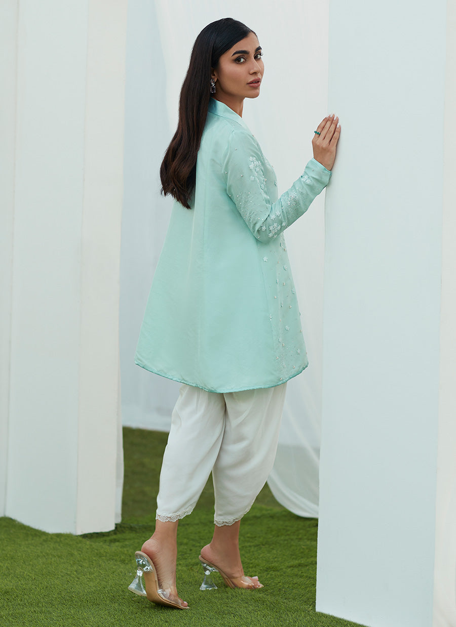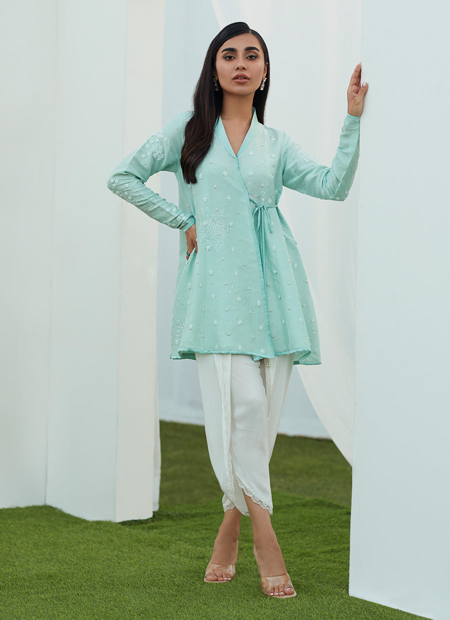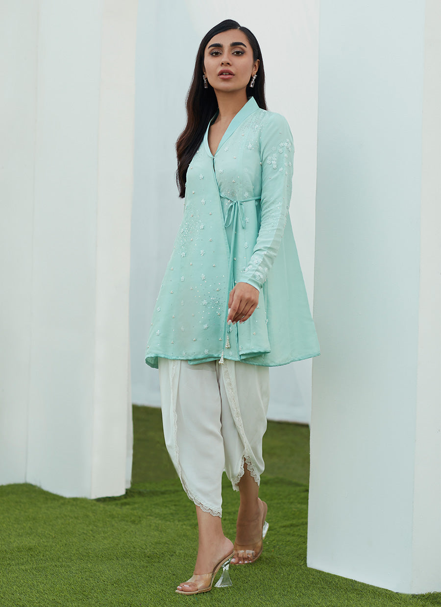 Delicately embroidered, with sequins and pearl hand embellishments. The thigh skimming wrap top that loosely cinches at the small of your waist creates a fabulously flattering effect.