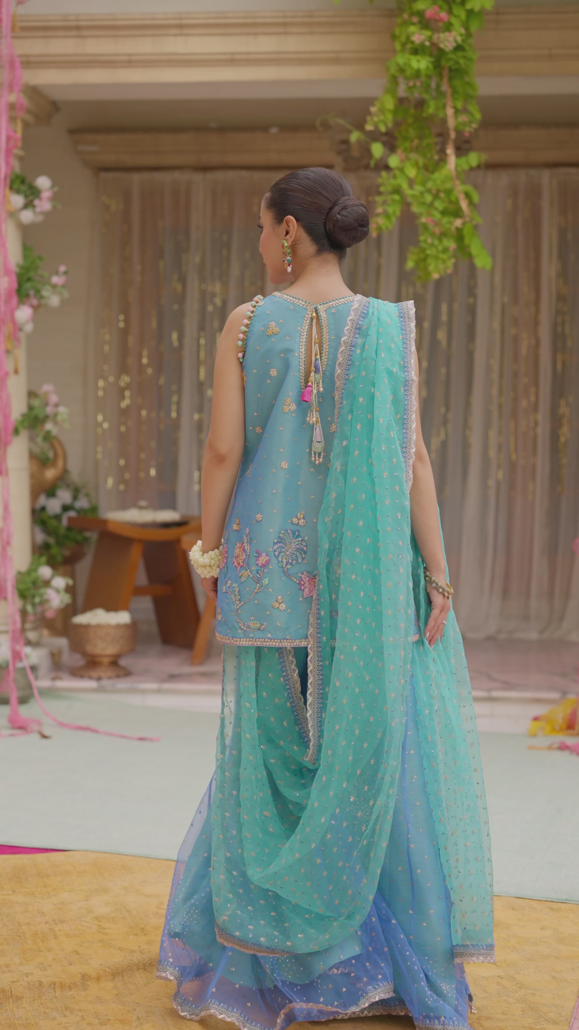 One of our favourites from this season, easy breezy, effortless luxe. A vibrant blue net short shirt adorned with embroidered floral motifs and appliques, creating a delightful mix of colors and textures. The shirt features gota and naqshi work, complemented by intricate embellishments including zardozi, kora, dabka, and sitara, which add a touch of opulence and traditional charm. The shirt is paired with a net dhaka, enhancing the ensemble's richness and finished with a hand embellished zari border that adds a hint of sophistication and ties the look together seamlessly. Completing the outfit is an aqua organza dupatta embellished with blue sitara chann all over, adding a subtle shimmer and enhancing its ethereal beauty. The dupatta is adorned with a zari border and gota all around, complementing the shirt and dhaka. Aqua zar lining under the entire outfit provides a luxurious finish, elevating the ensemble's overall appeal. This ensemble is perfect for celebratory occasions where you wish to stand out with its vibrant colors, intricate detailing, and elegant design.