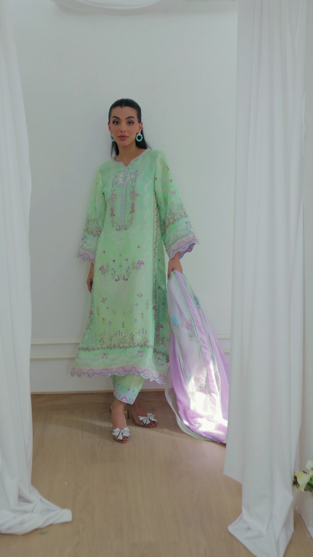 The elegant, straight shirt is paired with a pure medium silk dupatta in lavender, trimmed with organza embroidered with vibrant blooms.