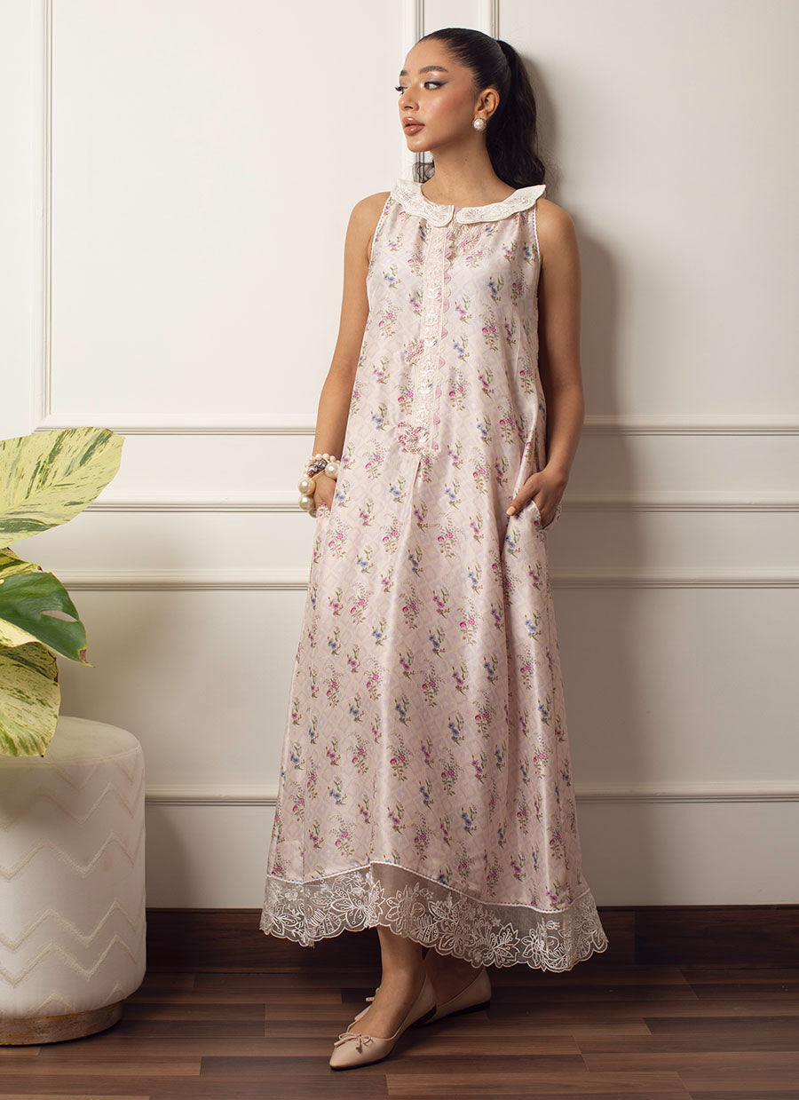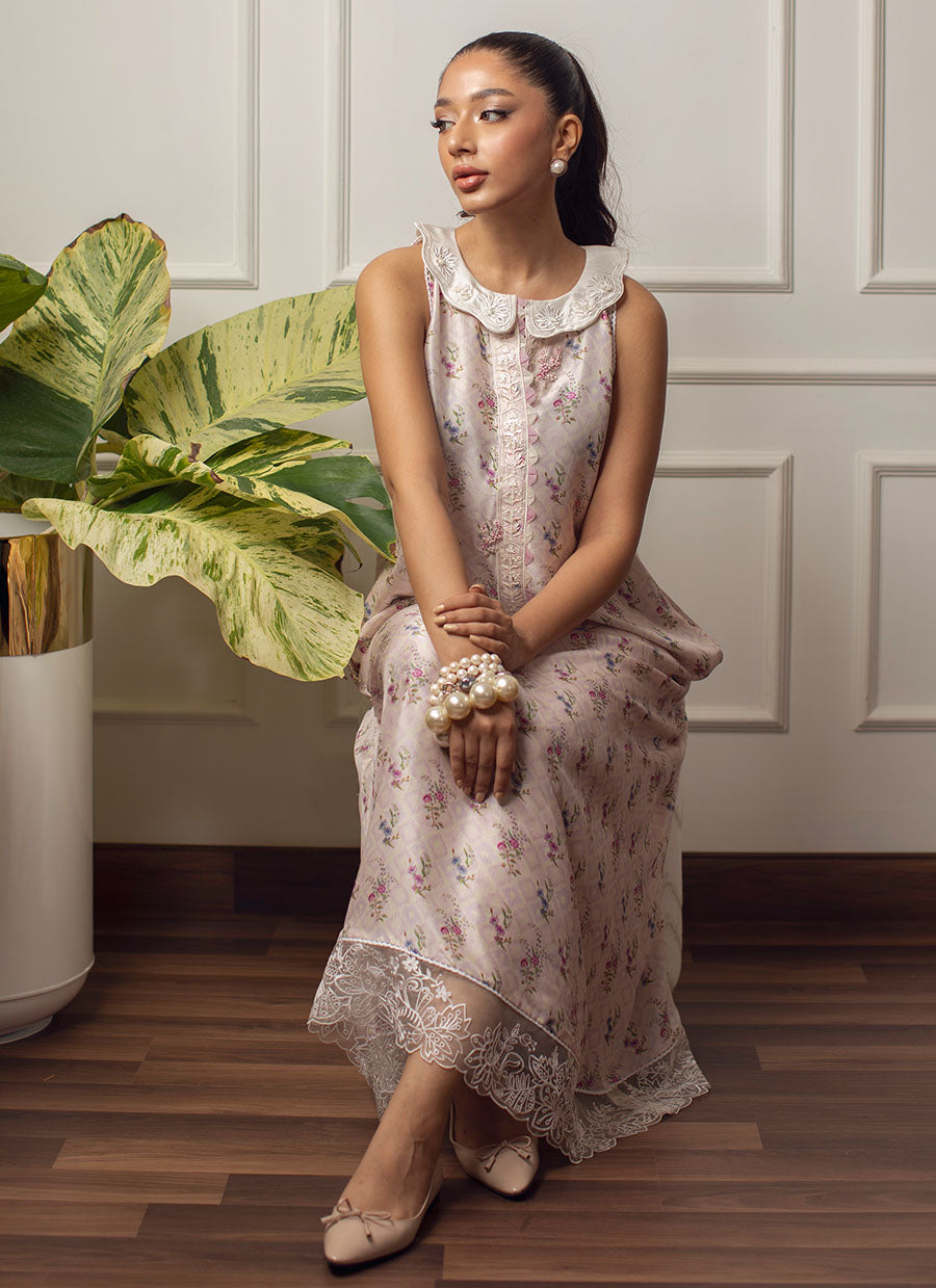 Cut from pure raw silk, Fina Bella is a soothing pale lavender silk, printed with blissfully delicate florals. The ankle length hem is adorned with a delicate lace, while embroidered, scalloped peter pan collar cut from pure silk, gives a fun, playful feel.
