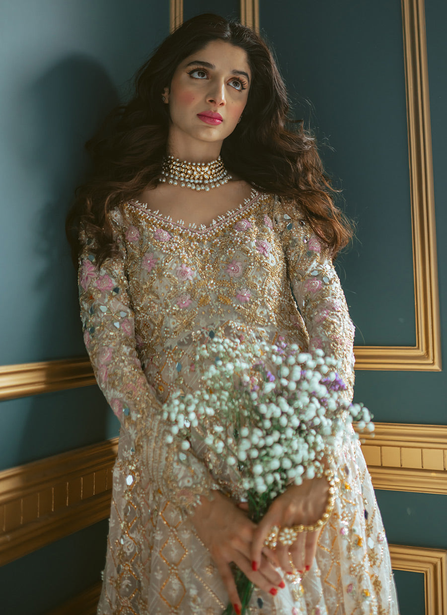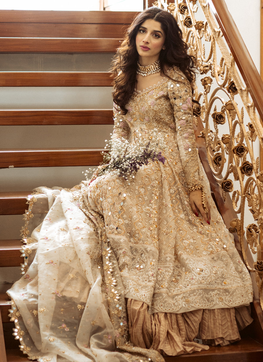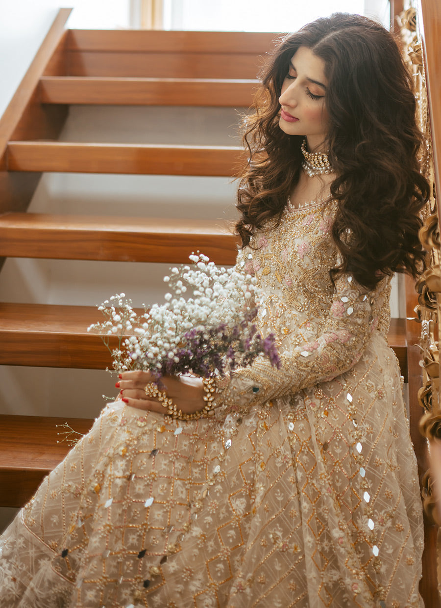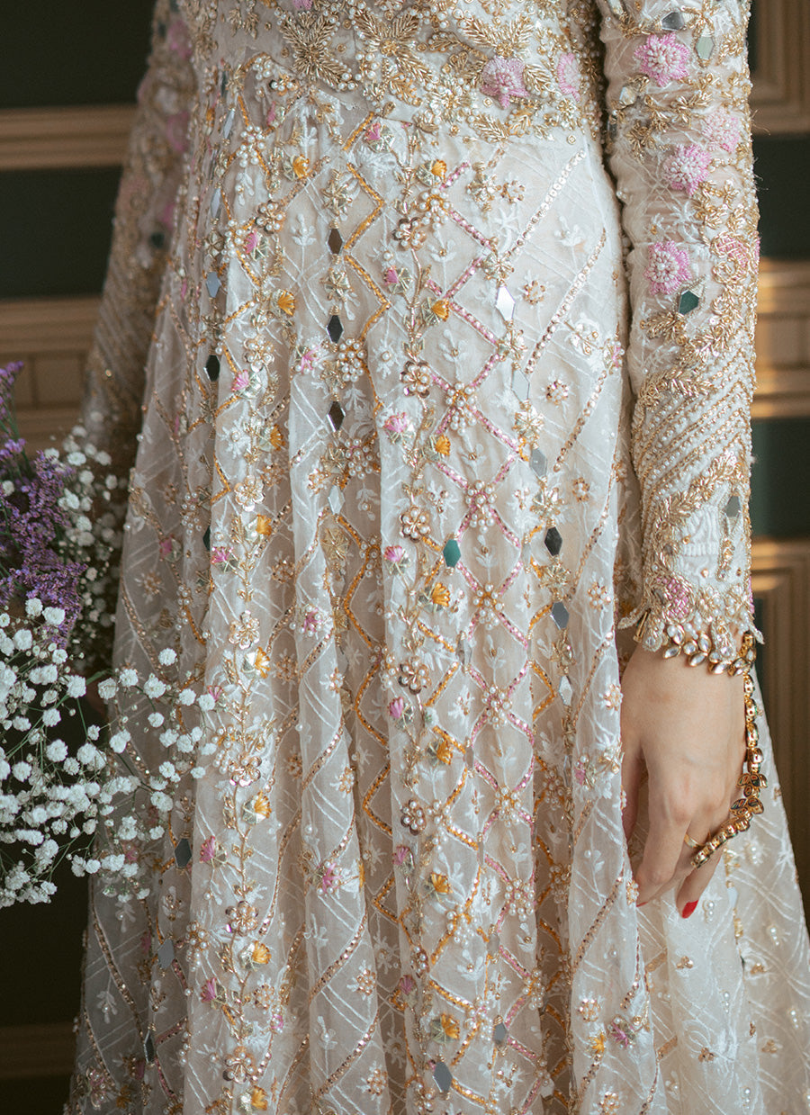 A canvas of pristine ivory is brought to life with shades of golds, mirror handwork and warm shades of silk thread work providing the perfectly pastel pops of colour in shades of pale lavender and pink, layered over a delicate embroidered floral trellis. A gorgeous cascading dupatta beautifully hand embellished add to the understated, glamour of this ensemble. A crushed Kalidaar maxi in rose gold tissue, makes this truly an unforgettable bridal.