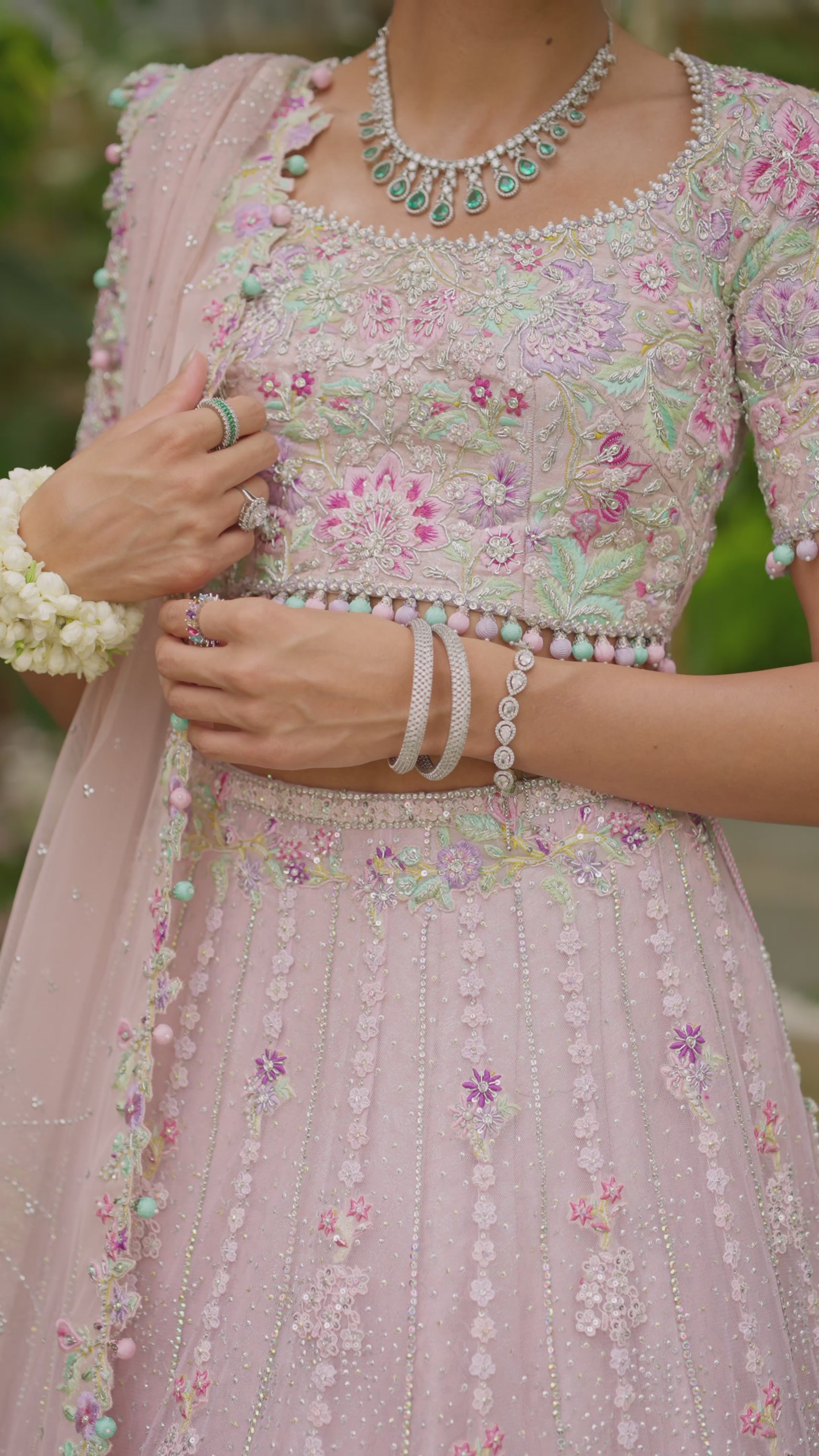 Farah Talib Aziz presents an effortless vision of graceful femininity with a capsule collection that captures the brand’s romantic aesthetic and modern elegance with extremely covetable results. Gisel is a flowing, floaty dream for you to indulge in. This season’s most irresistible trend, the new-age lehnga choli in a powdery pink hue.The impeccably tailored choli is intricately hand embellished with 3D blooms, subtly shimmering translucent sequins, Swarovski crystals and pearls, offset with irresistible hints of pink. The stunning back neckline with a fun pearl tassel, promises to have heads turning wherever you go. An extremely flattering silhouette, with a cascading lehnga cut from pure cotton net, lined with a lovely subtle silvery jamawar fabric, with a richly embroidered shimmering border. Delicate hand work emphasizes the small of the waist, to make you stand out. Lastly, the piece de resistance, is the sequin embellished, dupatta with an intricate hand embellished floral border and colorful finishings that complete the look of the outfit.Style yours with a sophisticated bun for an unforgettable style statement.
