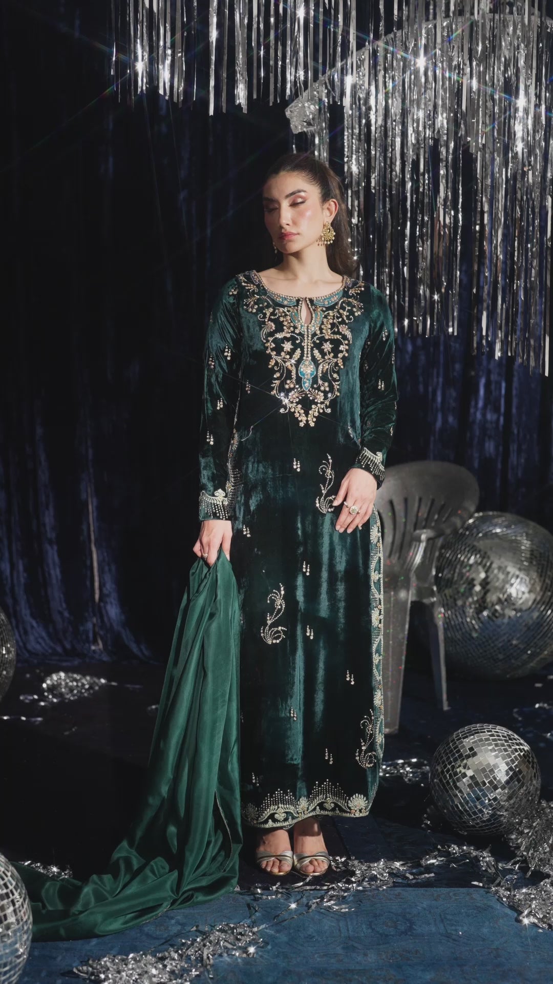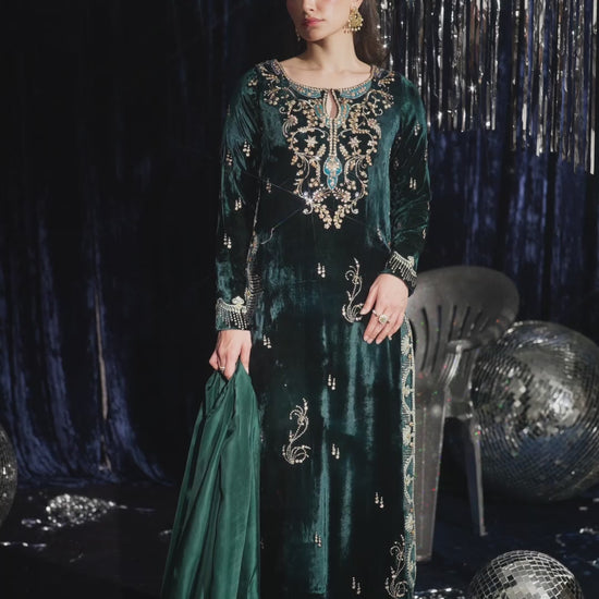 A vision of refined luxury — this deep green velvet ensemble captures timeless sophistication with exquisite craftsmanship. The long, straight velvet shirt is adorned with intricate hand embellishments in kora, dabka, nakshi, tilla, and resham, elevated with delicate appliqués in shades of teal. Finished with embroidered zari borders, intricate buti, and a soft spray all over, the look radiates effortless elegance. Paired with a beautifully dyed medium silk dupatta and matching raw silk izaar, both finished with zari borders, this ensemble is the perfect choice for those who appreciate understated glamour with a regal touch.