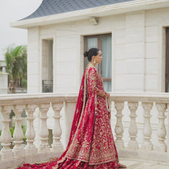A vision steeped in timeless grandeur, this ensemble glows in a soft golden hue, where artistry and heritage entwine. The pure cotton net front-open shirt in a deep red hue is adorned with a meticulous neckline, cascading into scallops of heavily embellished tulips, while an intricate sunburst jaal with delicate chan booti blooms across the surface, creating a play of light and texture. The farshi lehnga, rendered in pure gold jamawar, mirrors the shirt’s refined elegance. Its borders are elevated with delicate French detailing, while subtle aubergine appliqués are layered in to lend depth, dimension, and a regal contrast to the luminous gold. Completing the look, the cotton net dupatta is framed with a bold aubergine scalloped border, adorned with grand floral bootis and chan work, casting a romantic halo around the silhouette. A celebration of craftsmanship, this bridal ensemble fuses soft radiance with bold contrasts — a regal ode to tradition with a whisper of modern refinement.
