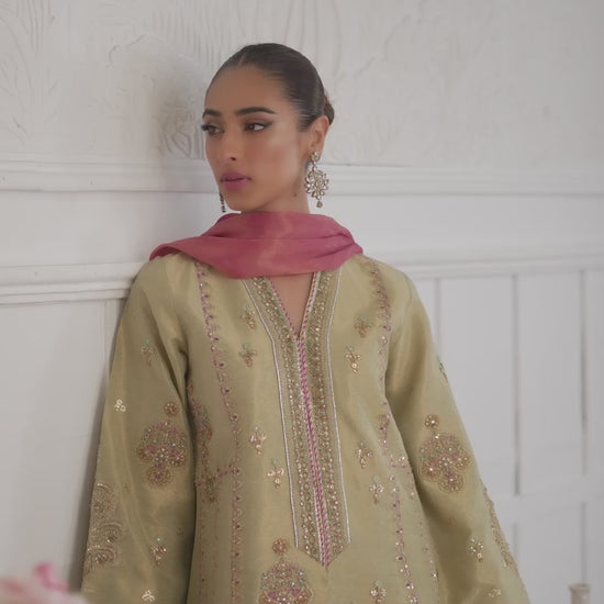 An ethereal shade of a pale pistachio green hue with a subtly shimmering, silvery zari sheen is completely hand embellished with zardozi, sequins, Swarovski crystals and silk thread work in soft pastel hues.