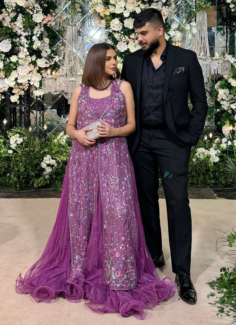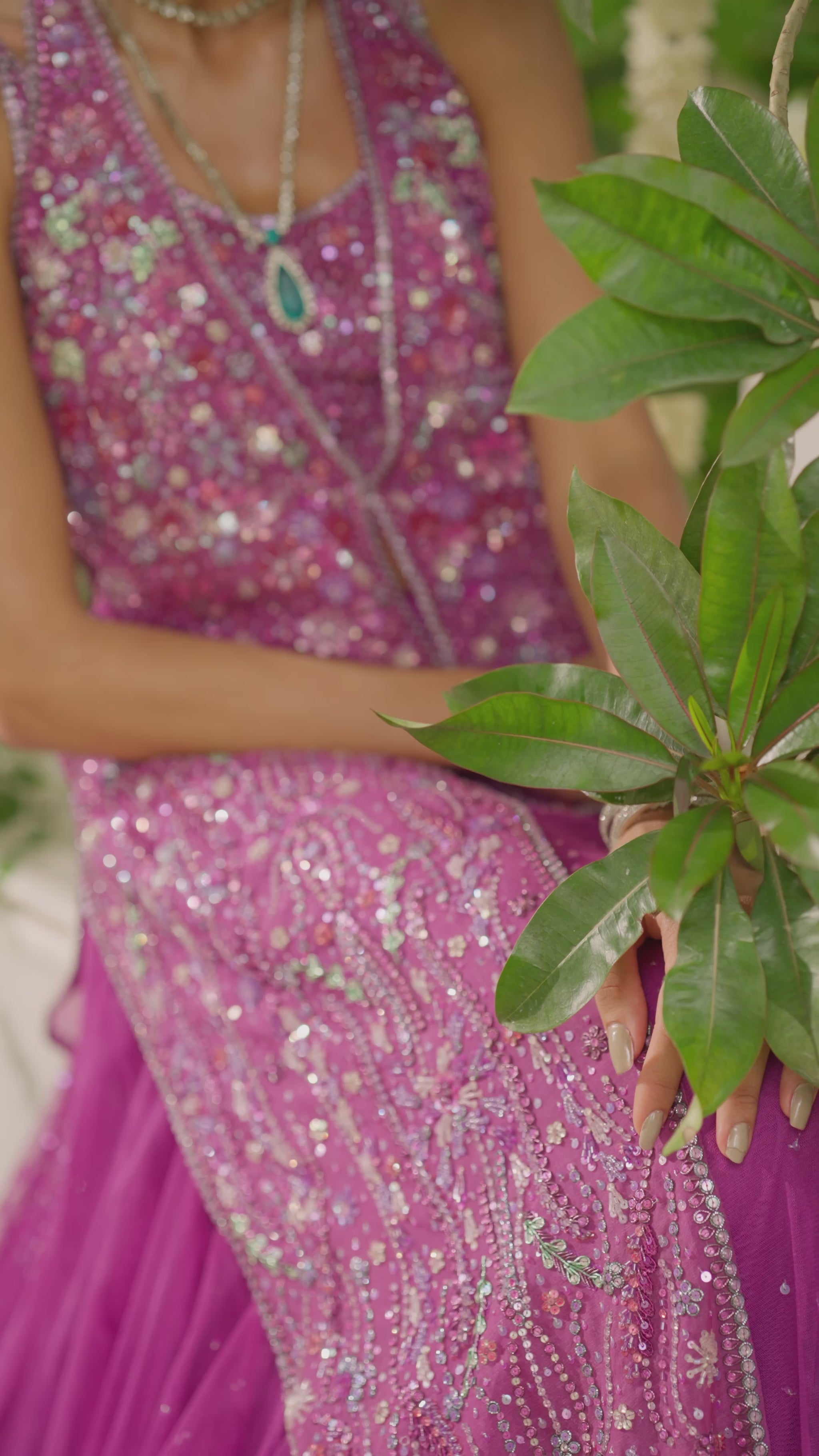 The jacket is layered over a gorgeous hand worked choli and a purple tulle lehenga.