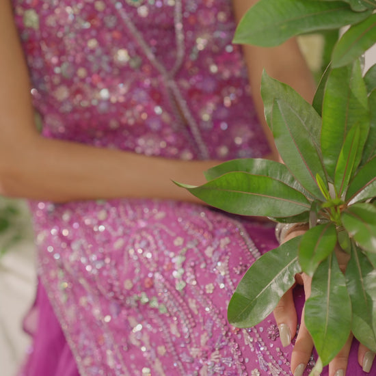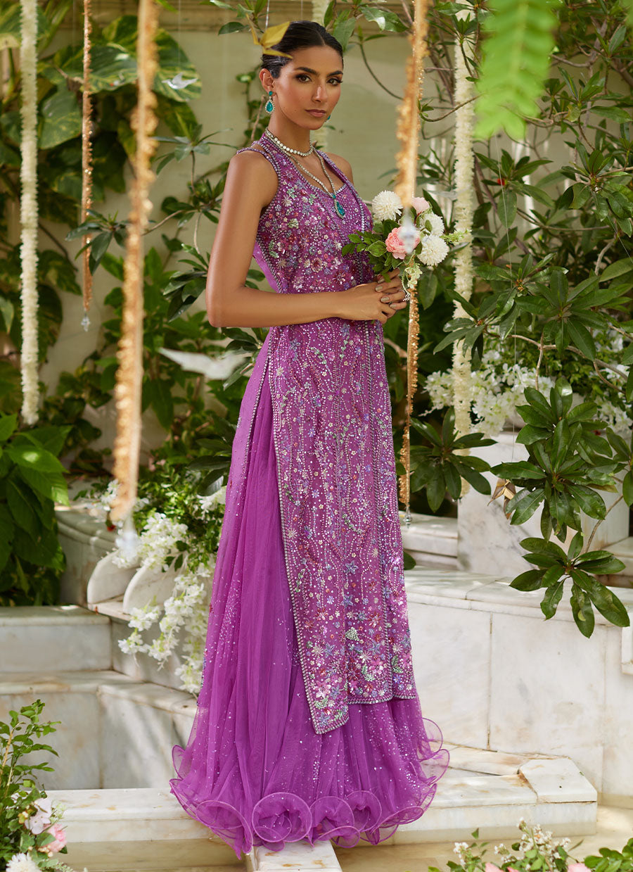 Flattering and feminine, a modern ethereal sleeveless shirt that's sure to make an instant style statement. This ensemble features a purple pure net front open jacket that is adorned with shimmering hand embellishments, cut work, Swarovski crystals and intricate applique. An uber flattering neckline that's also fully hand worked with delicate details adds that extra oopmh to this swoon-worthy ensemble.