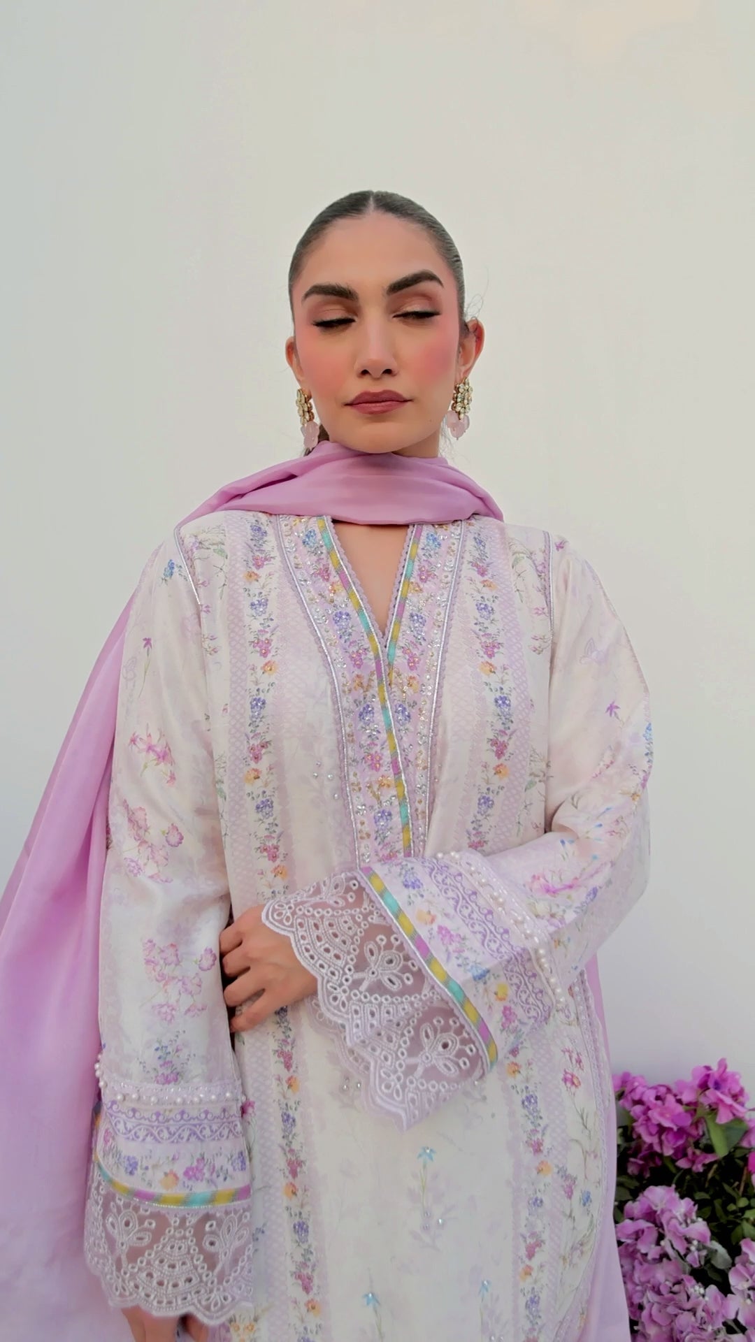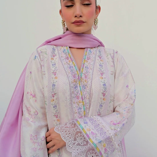 Cut from sumptuous raw silk, the shirt is printed with whimsical florals that bloom daintily all over the shirt, making this an absolute must have. The relaxed, much loved silhouette has a universally flattering “talpat” neckline, adorned with delicate hand-made floral motifs, pearls and sequins, add an easy timeless elegance. The shirt hem and the sleeves are trimmed with embroidered borders and delicate lace. The graceful, relaxed fit shirt is paired with a pure medium silk dupatta in coordinating lavender trimmed with organza borders embroidered with vibrant blooms. Pair yours with our embroidered organza cutwork pants as shown.