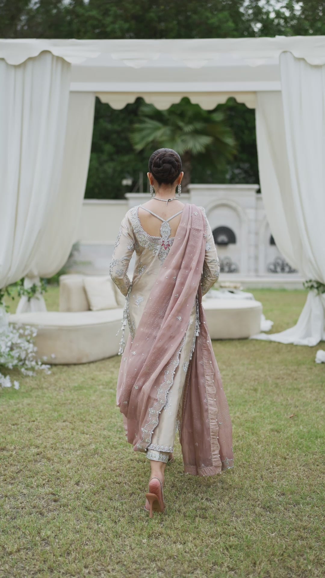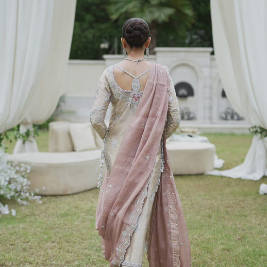 In soft champagne gold, this ensemble radiates quiet sophistication with an heirloom quality. The straight tissue shirt glimmers with intricate handwork — kora, dabka, sequins, crystals, and raw silk appliqué — each detail enhancing the luminous texture of the fabric. Paired with a voluminous raw silk dhaka pajama, the silhouette feels graceful yet rooted in tradition. A blush-toned zari silk dupatta softens the palette, draping the look in a romantic finish. Subtle yet striking, this piece is designed for celebrations that call for understated luxury.