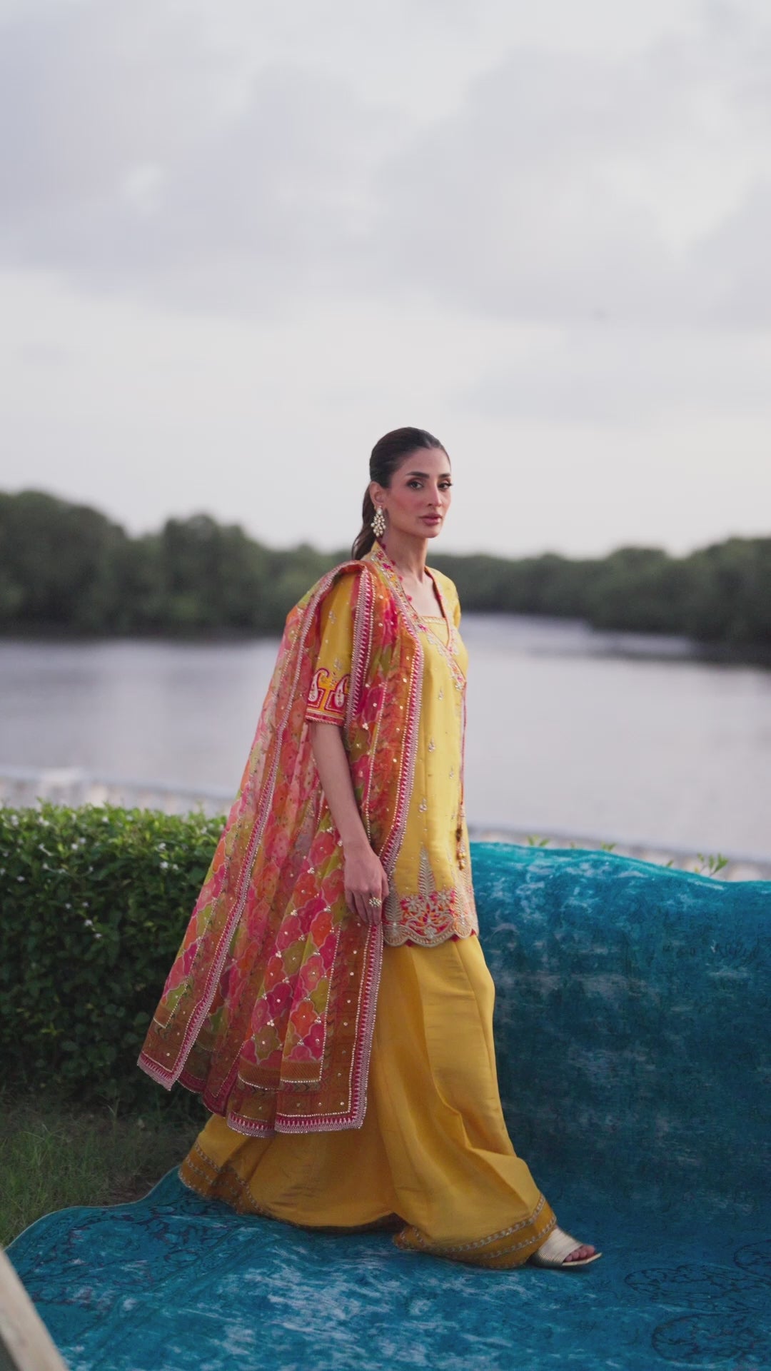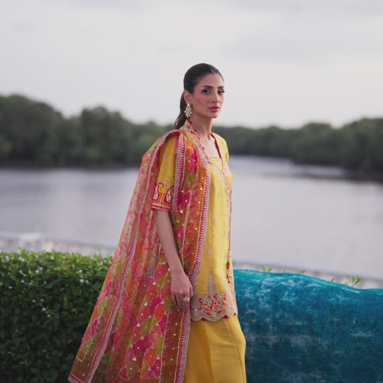 Effortlessly chic and endlessly flattering — this saffron ensemble guarantees you’ll be the best-dressed wherever you go. Crafted from soft zari silk, the thigh skimming shirt features a universally flattering neckline, elbow length sleeves and elegant side slits that create a fluid silhouette. Delicately adorned with pale gold embroidery and appliqued borders, finished with a scalloped hem, it radiates understated luxury.