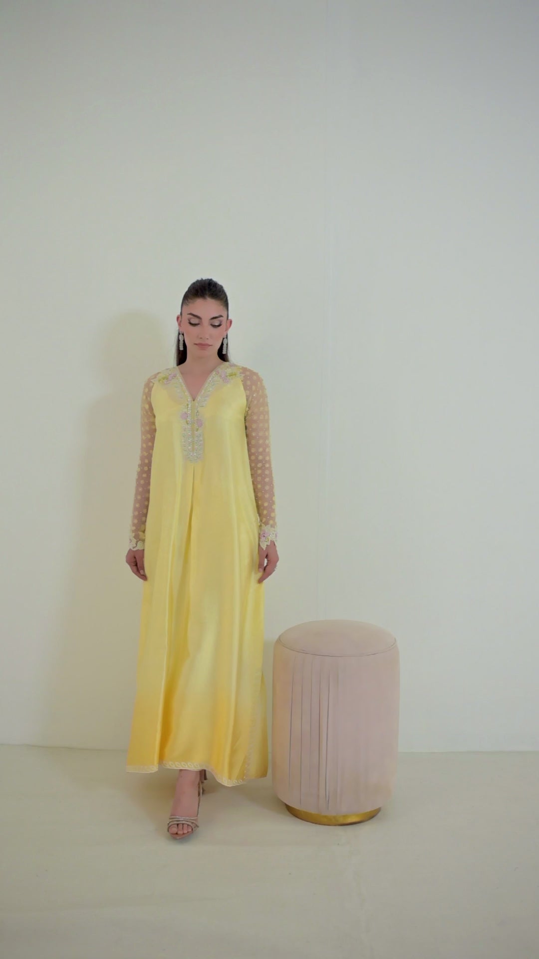 A vision pale lemon, this flowing shisha silk shirt fades seamlessly into a deeper, buttery hue for striking dimension. The modern embroidered neckline and sleek, statement sleeves — crafted from embroidered organza and finished with whimsical pearl tassels — bring a playful yet refined drama. Paired with pure silk pants and sparkly heels, this is your go-to for brunches, teas, or dinners where chic ease is non-negotiable.