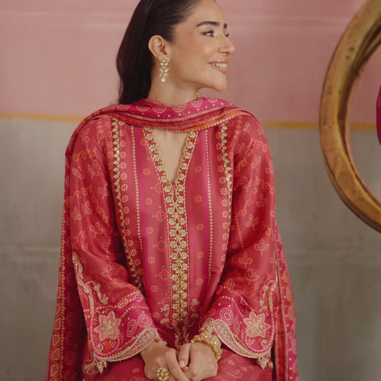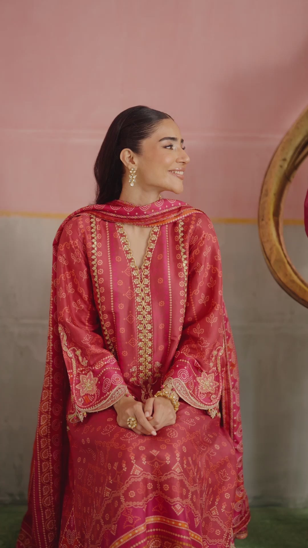A rich maroon canvas, brought to life with a delicate tonal print and refined hand embellishments. The pure raw silk A-line kurta is adorned with zardozi and silk thread work, accentuating the neckline and sleeves, while zari borders at the hem add a touch of traditional grandeur. A pure medium silk dupatta, framed with resham and zari borders, this ensemble strikes the perfect balance of timeless sophistication and contemporary cool.