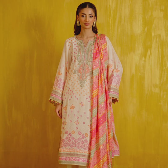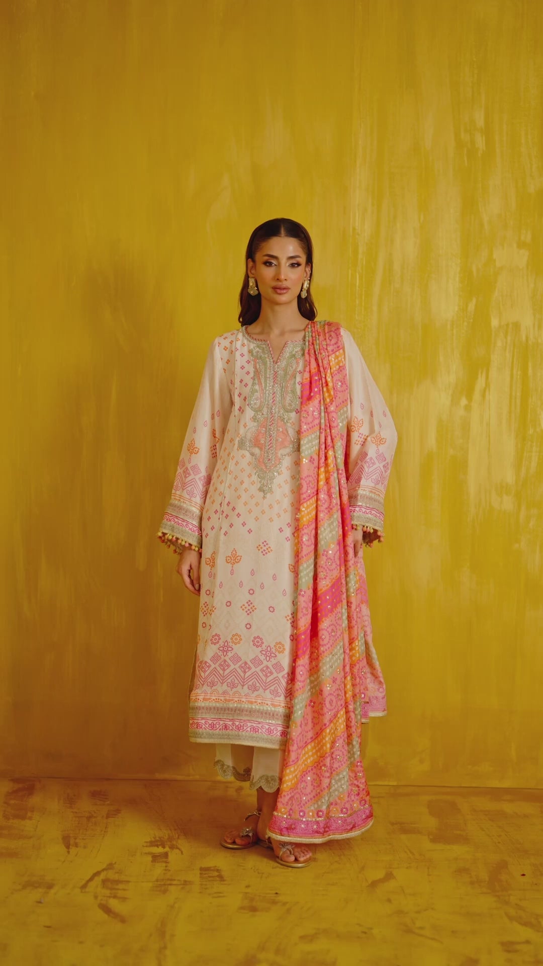 An ethereal ivory canvas, cut from pure raw silk and brought to life with an irresistible chunri print in fresh, lively hues. The relaxed silhouette features a universally flattering neckline, delicately hand-worked with pearls and sequins for a touch of dreamy elegance. Paired with a coordinating pure medium silk dupatta, digitally printed in stunning hues, this ensemble strikes the balance between charm and sophistication. Style it with our pure raw silk pants and statement earrings for an effortlessly eye-catching look.