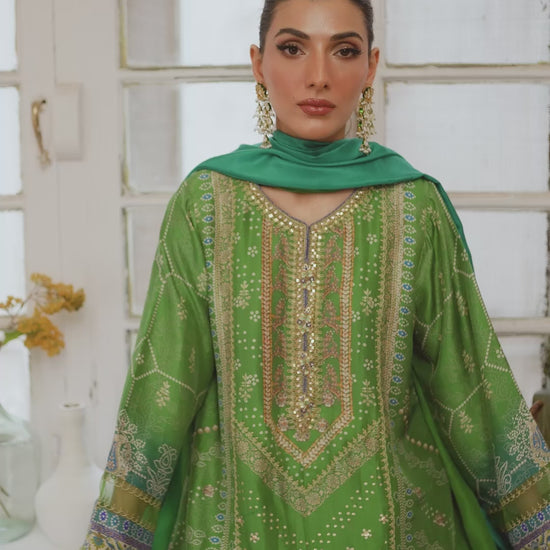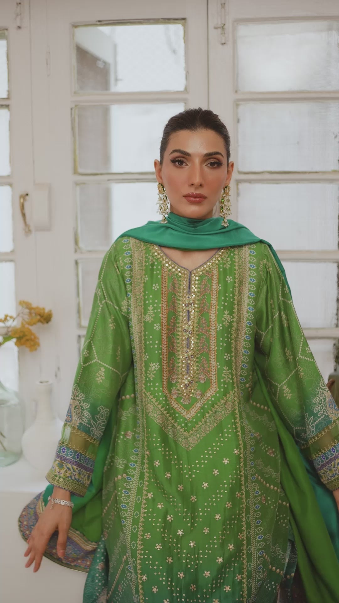 A relaxed silhouette, tailored from sumptuous pure raw silk, in the colour of the season, a beautiful vibrant green hue, smoothly flows into a striking teal colour at the daaman.