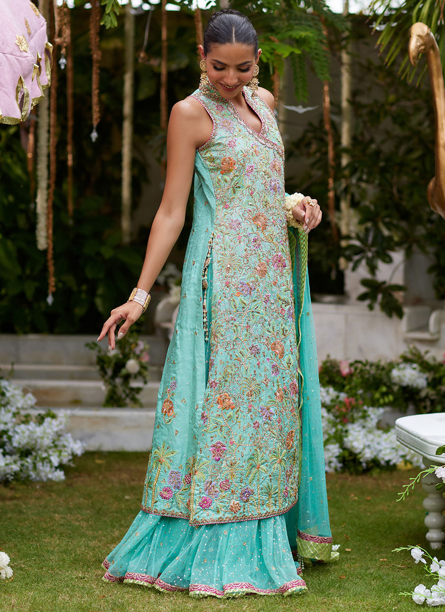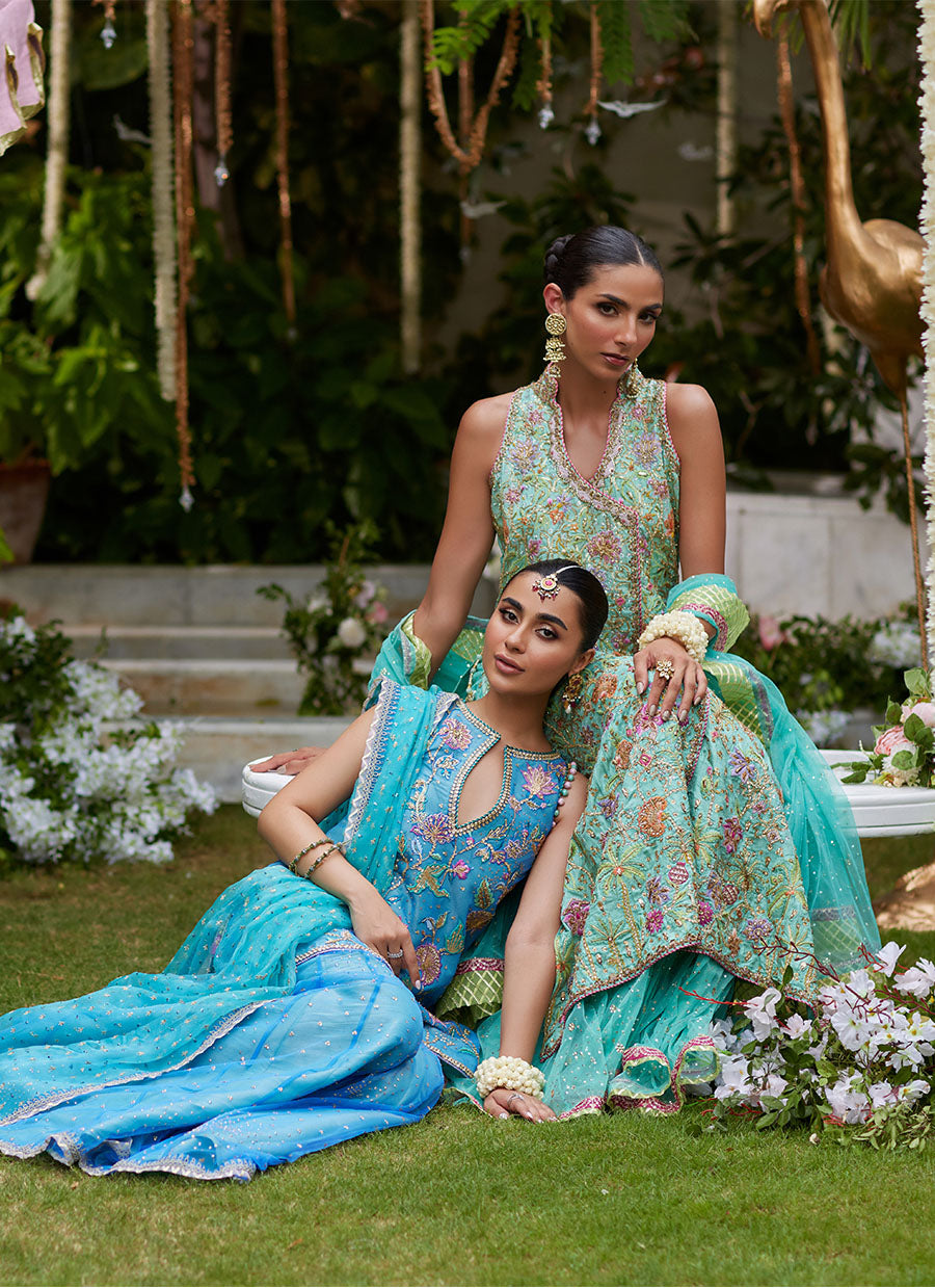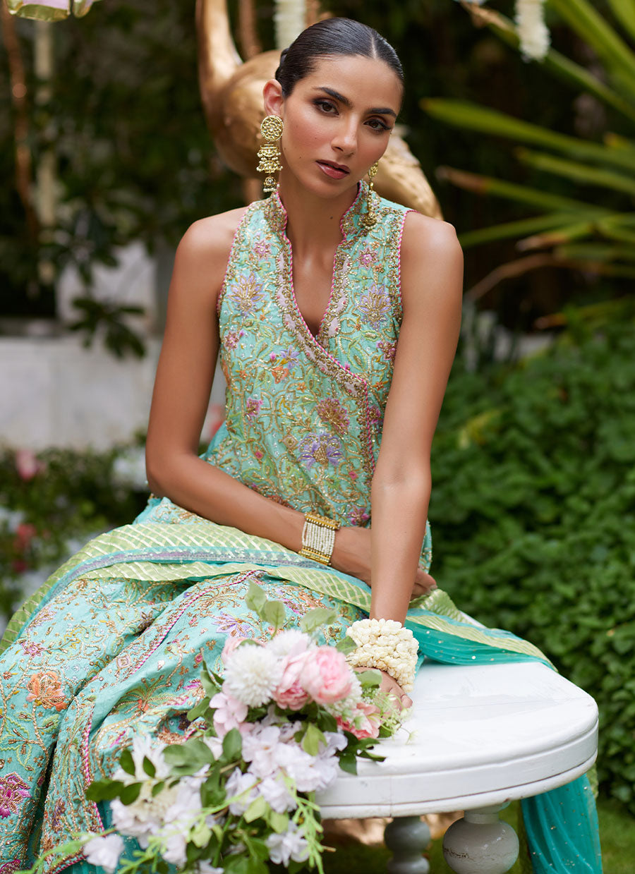Contemporary silhouettes meet exquisite crafts and hand embroidery painstakingly rendered on pure, luxe fabrics. Be the epitome of effortless glamour with our ethereal aqua ensemble. A dramatic angarkha cut from self jamawar silk, hand embellished with appliques, pearls, kora, gota, dabka, Swarovski crystals and pure silk thread work. The beauty of this outfit is further elevated with a delicate border. Paired with a pure net hand embellished lehenga adorned with gota finishing. This undeniably glamorous ensemble will be your ultimate choice for all festive occasions for years to come.