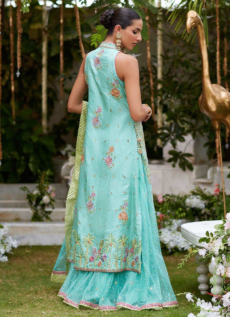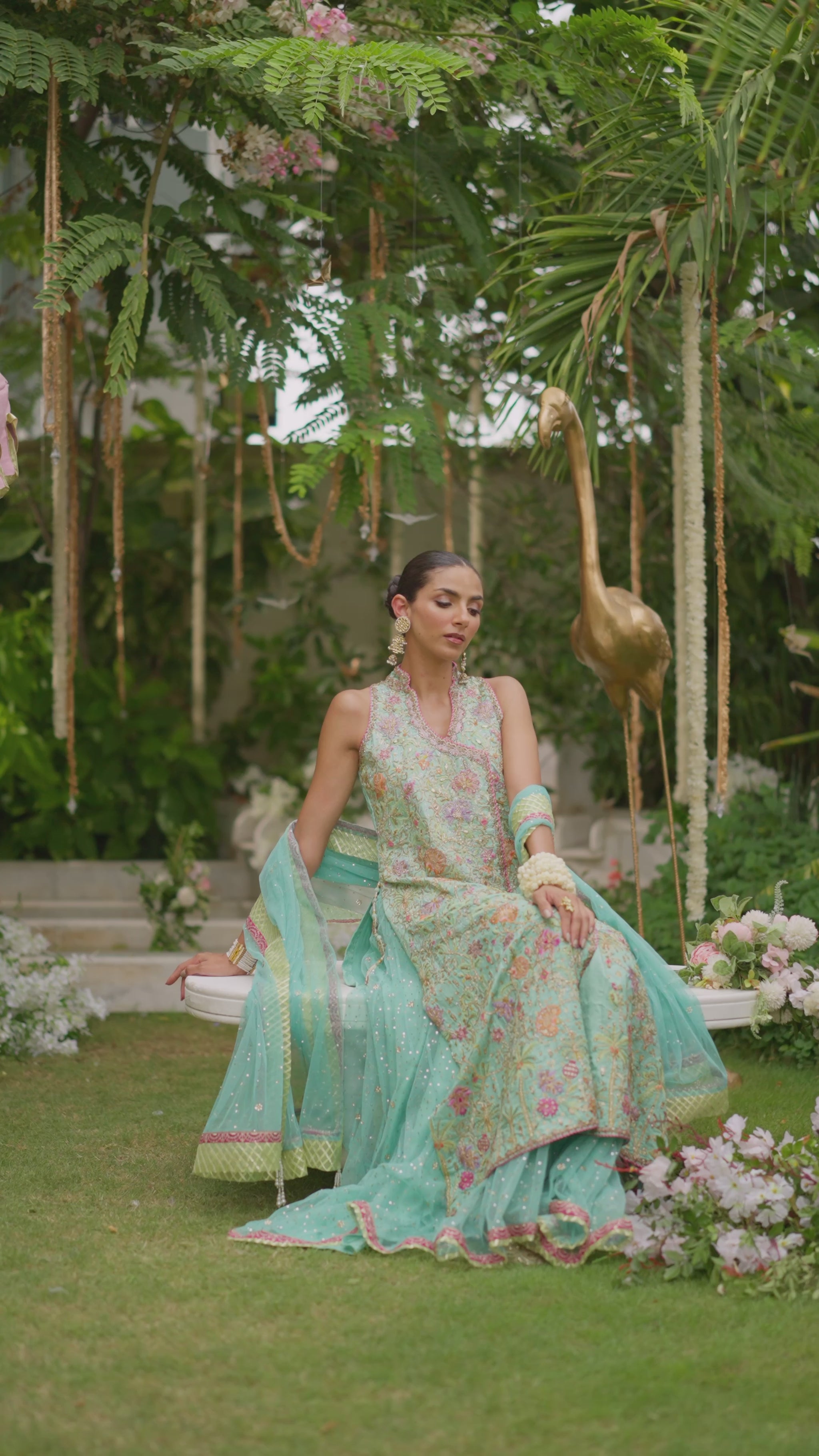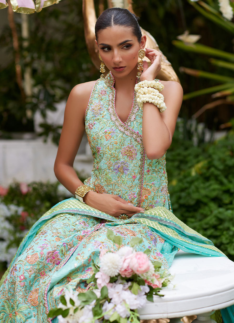 Contemporary silhouettes meet exquisite crafts and hand embroidery painstakingly rendered on pure, luxe fabrics. Be the epitome of effortless glamour with our ethereal aqua ensemble. A dramatic angarkha cut from self jamawar silk, hand embellished with appliques, pearls, kora, gota, dabka, Swarovski crystals and pure silk thread work. The beauty of this outfit is further elevated with a delicate border. Paired with a pure net hand embellished lehenga adorned with gota finishing. This undeniably glamorous ensemble will be your ultimate choice for all festive occasions for years to come.