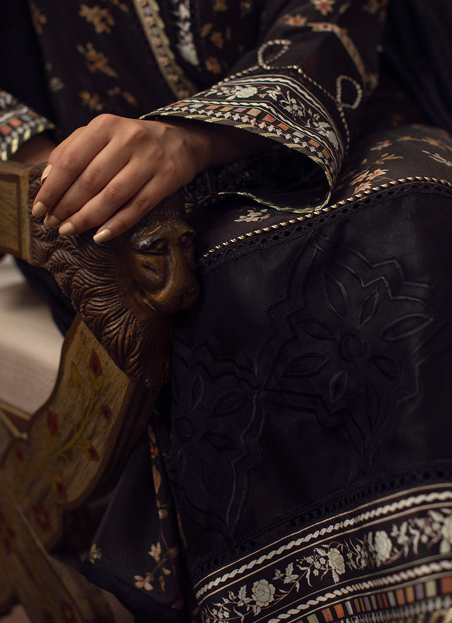 Cut from pure onyx silk, the Kitana shirt is adorned with a whimsical floral pattern in bohemian earthy tones. The neckline has intricate hand worked embroidery The sleeves feature “dori” embroidery on translucent organza as well as delicate gota detailing. The daaman has appliqued organza embroidery and dori and gota detailing.
