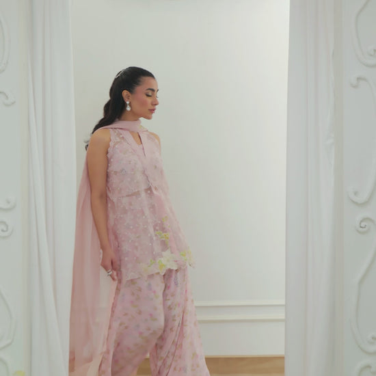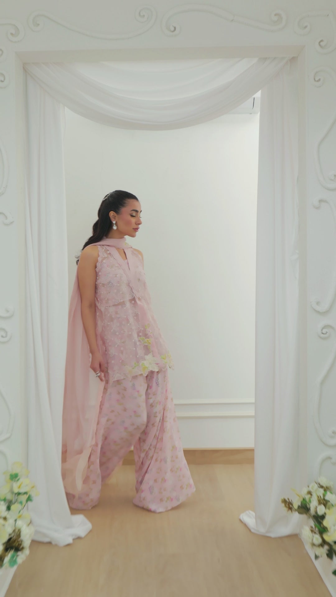 The mesmerizing jacket cut from pure organza in a blush pink is decorated with cut work botanical motifs all over is further uplifted with meticulously hand embellished pearls, Swarovski crystals, sequins and 3D flowers. The striking, translucent jacket is layered over a forever flattering, printed bustier.