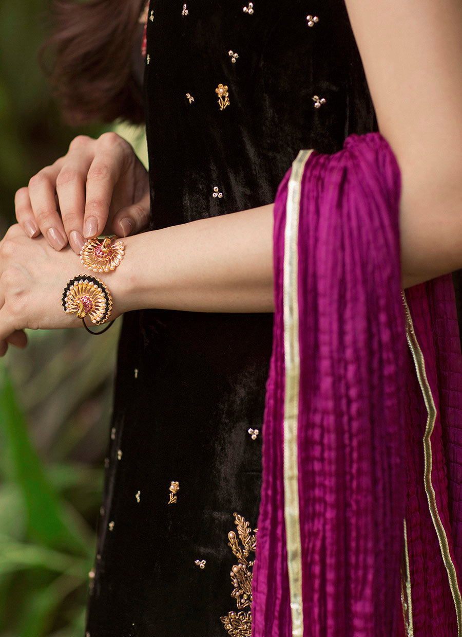 A gorgeous, deep black velvet shirt with an intricately embellished neckline in gold and silk-thread work in shades of emerald, fuschia and magenta. The stunning back has a lovely detailed neckline, sure to make an impact at any event this festive season. Pair your outfit with our delicately embellished velvet izaar and statement earrings for an effortlessly chic look.