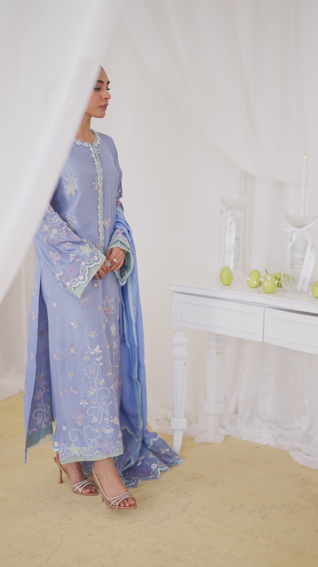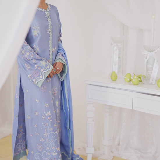 A refreshing shade of Periwinkle blue raw silk with delicate, pearl motifs all over is the ultimate must have for this spring. The relaxed, much loved silhouette has a universally flattering neckline, is gorgeously hand worked with pearls, sequins. The entire shirt is adorned with delicate embroidery is soothing pastel hues with gorgeous scalloped sleeves and hem, trimmed with organza. A pure medium silk dupatta with embroidered organza pallus completes your ensemble. Pair your outfit with our pure raw silk pant (as shown), and minimal earrings for a stunning look, no matter the occasion.