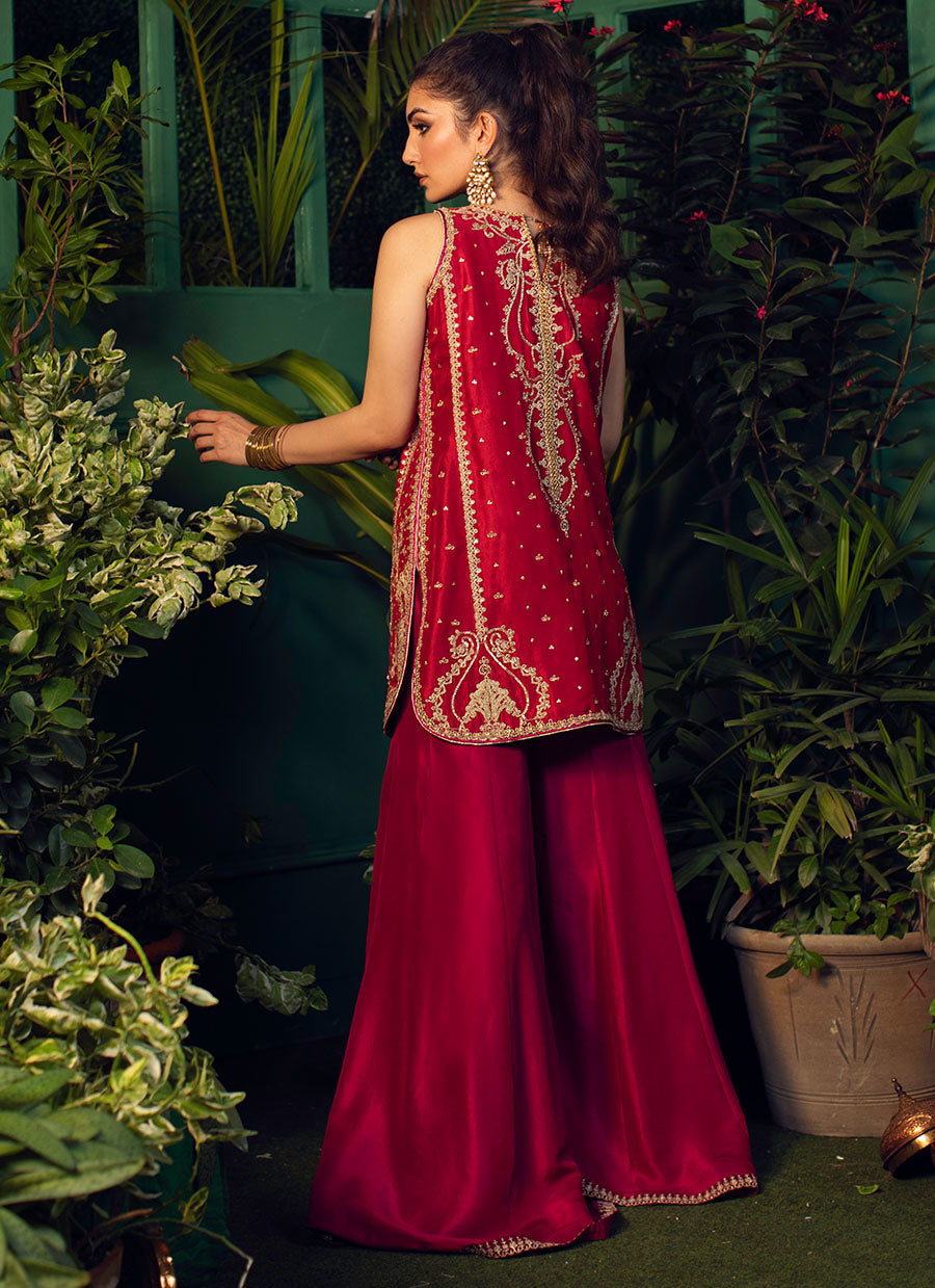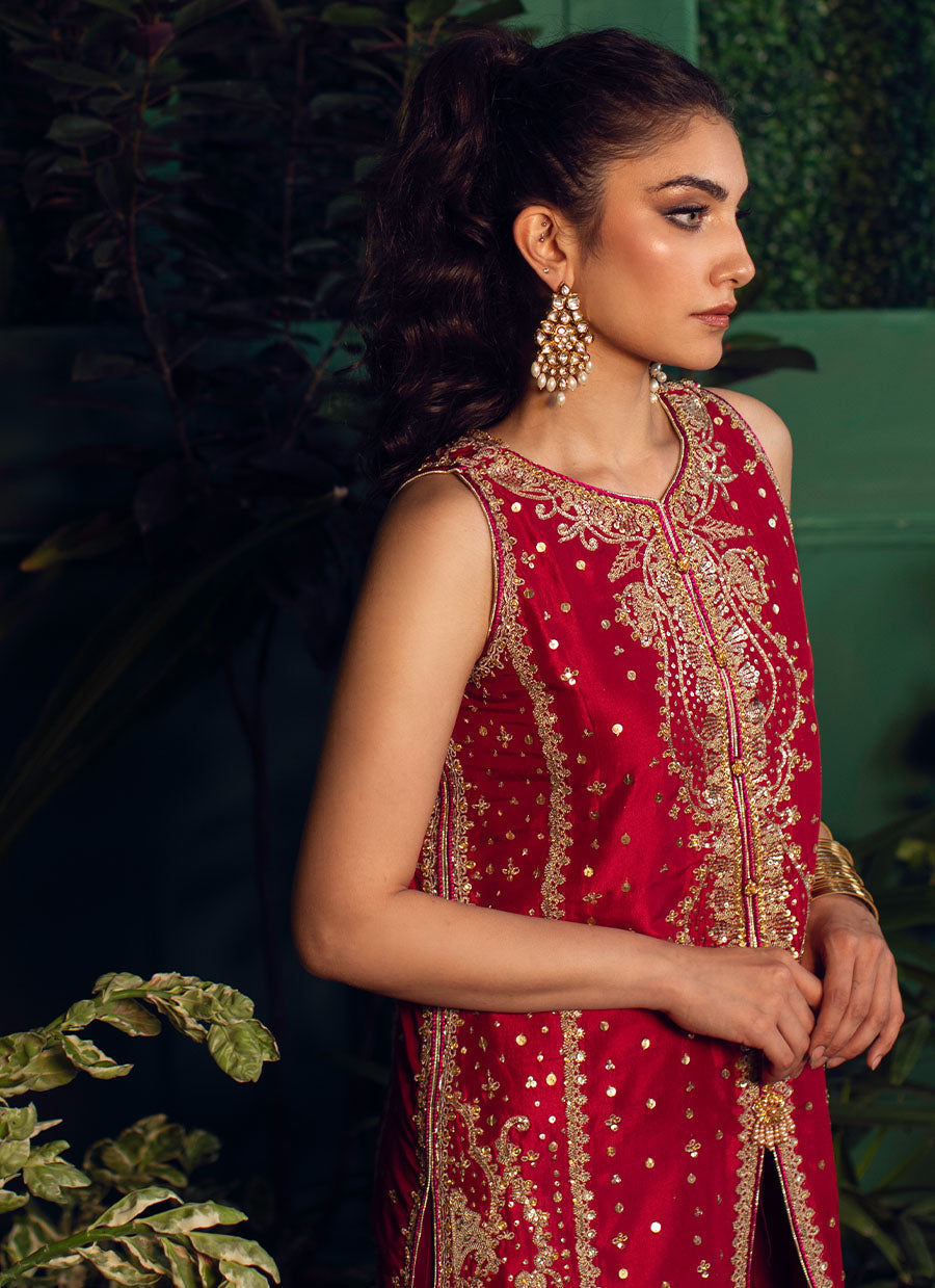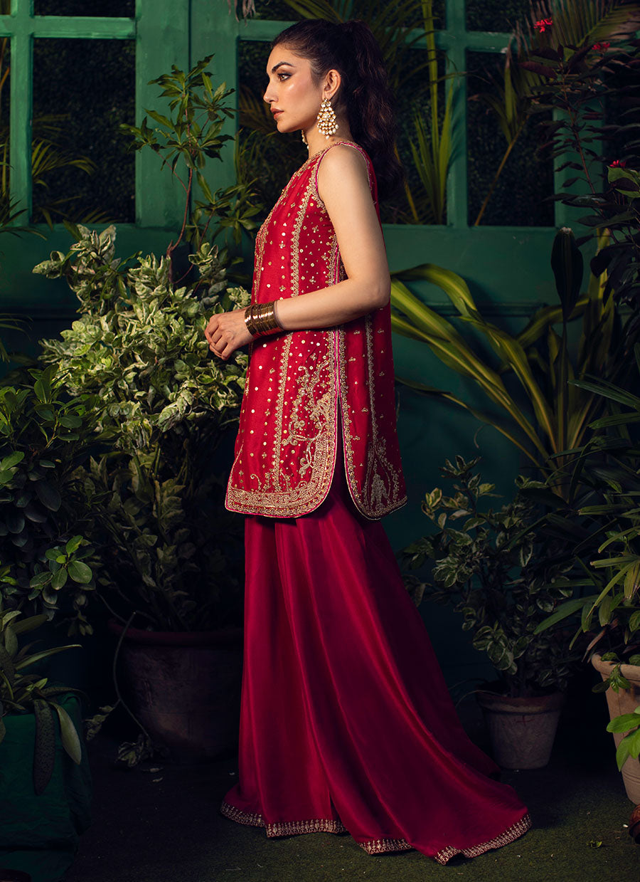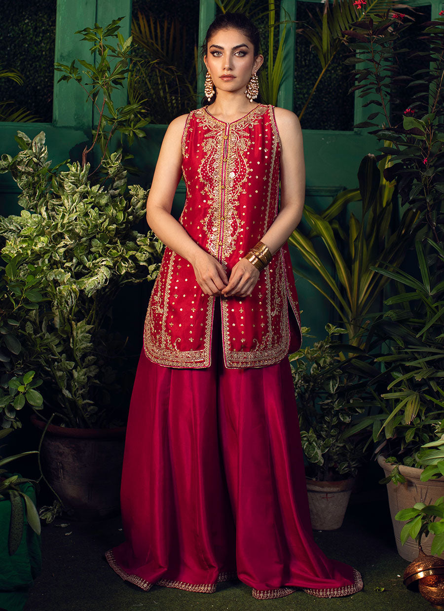 Richly embroidered, with sequins, gota and aari hand embellishments. The thigh skimming top creates a lovely slimming effect. The wide leg flared pants, edged with hand embroidery in pale gold make it an absolute fail-safe piece for any manner of occasion.