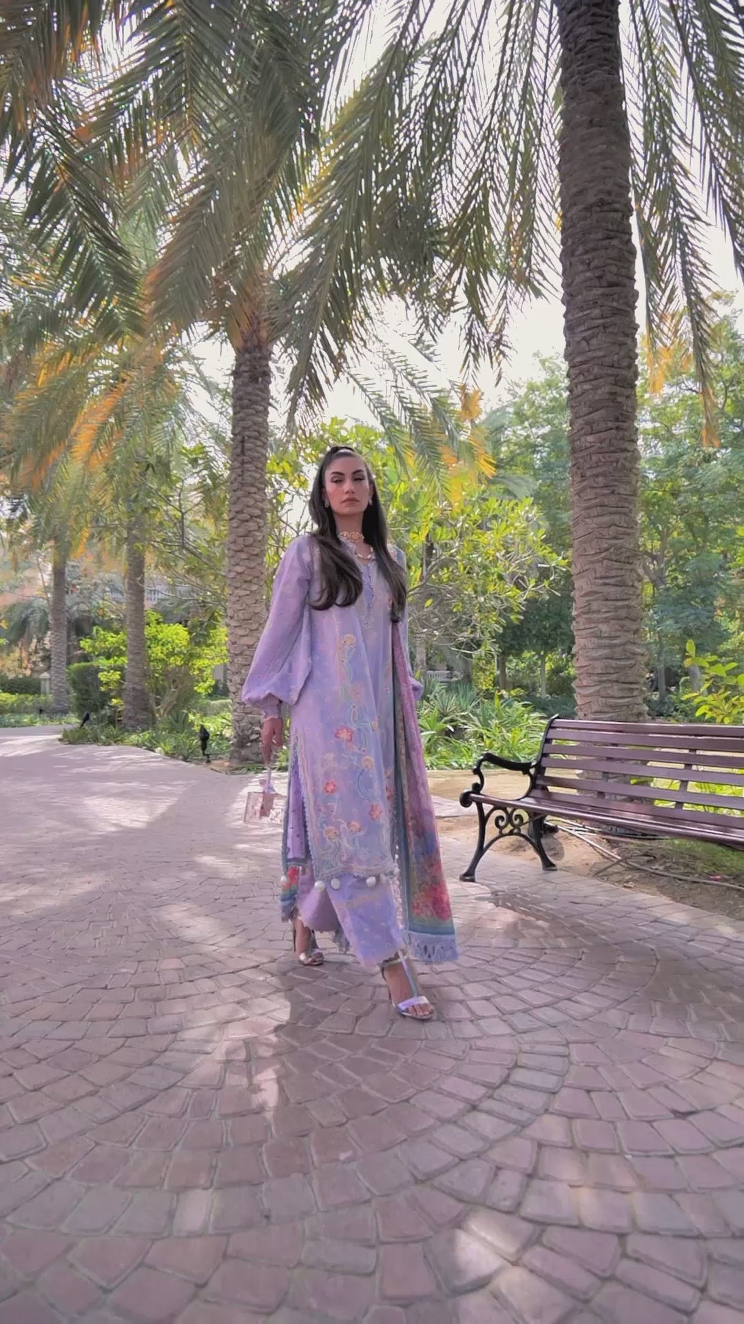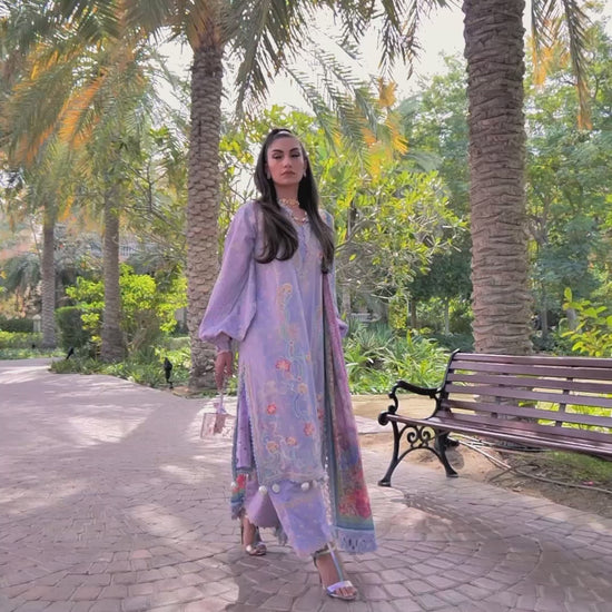 Reinventing your classic lavender outfit for a look easily carried from day to night. A soft PIMA lawn featuring delicate floral and geometric embroideries across the shirt, unmissable borders and floral scalloped trimmings. An airy, floaty pure chiffon dupatta featuring the uplifting shades of a pink sunset make this outfit truly unforgettable. The comfortable, jacquard pants will keep you breezy day or night. Liliana Lavender is one of those modern classics, you just simply love forever!
