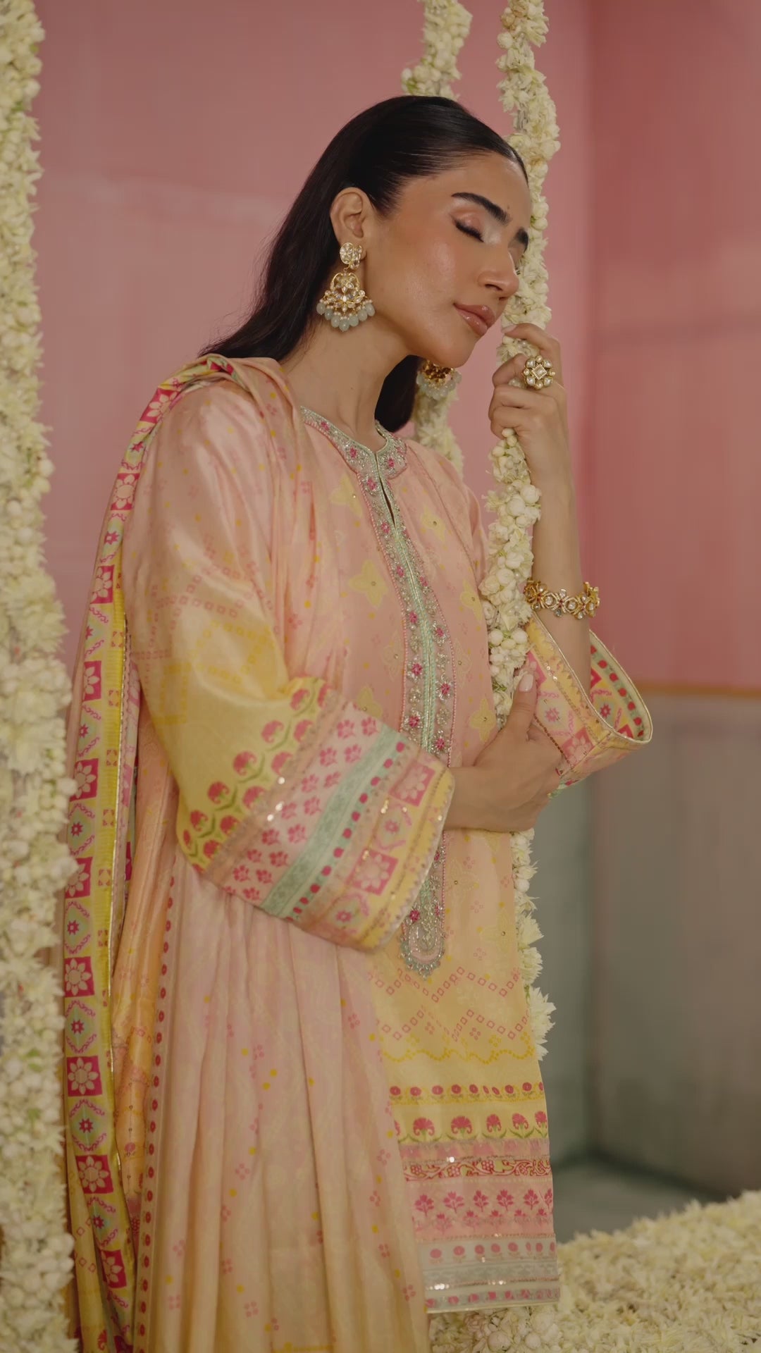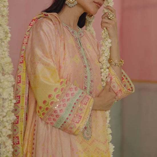 Crafted from pure raw silk , this shirt is adorned with a gorgeous chunri print for an irresistibly fresh look. The relaxed silhouette, is given an ombre treatment, strikes the perfect note of dreamy charm. Paired with a coordinating ombre, pure medium silk dupatta and coordinating printed raw silk Pant (as shown), this ensemble is your chic, effortless answer to all festivities.