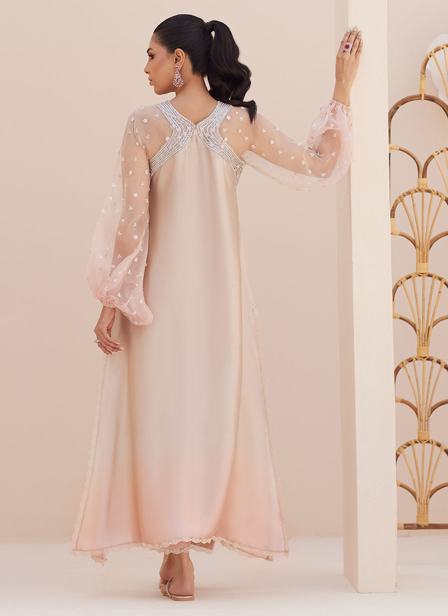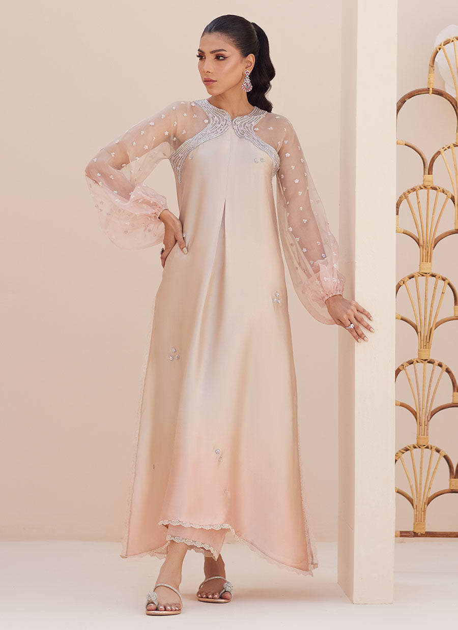 The perfect choice for year-round celebrations. A striking silvery sand hued shirt, that seamlessly flows into a whimsical pink hue is cut from shiny shisha silk and features a delicately hand embroidered modern neckline and dramatic lantern sleeves. The statement sleeves are cut from embroidered organza shimmering sequins as well. The perfect outfit to see you through brunches, afternoon teas and dinners with effortlessly chic ease.Style yours with our pure silk pants and sparkly heels for an utterly captivating look.
