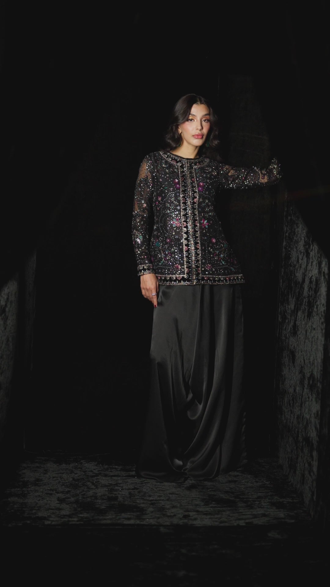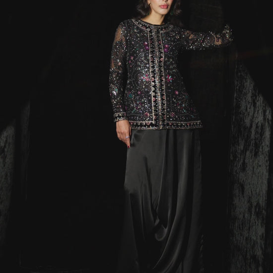 Striking and contemporary, this black organza jacket is a vision of modern elegance. Intricately hand-embellished with colored crystals and naqshi, it exudes a subtle radiance with every movement. The short, front-open silhouette is edged with a plush velvet appliqué, exquisitely adorned with resham and naqshi detailing — a true testament to artisanal craftsmanship. Paired with a sleek raw silk bustier and a fluid black crepe silk skirt, this ensemble seamlessly balances structure and softness, making it the ultimate statement of refined glamour.