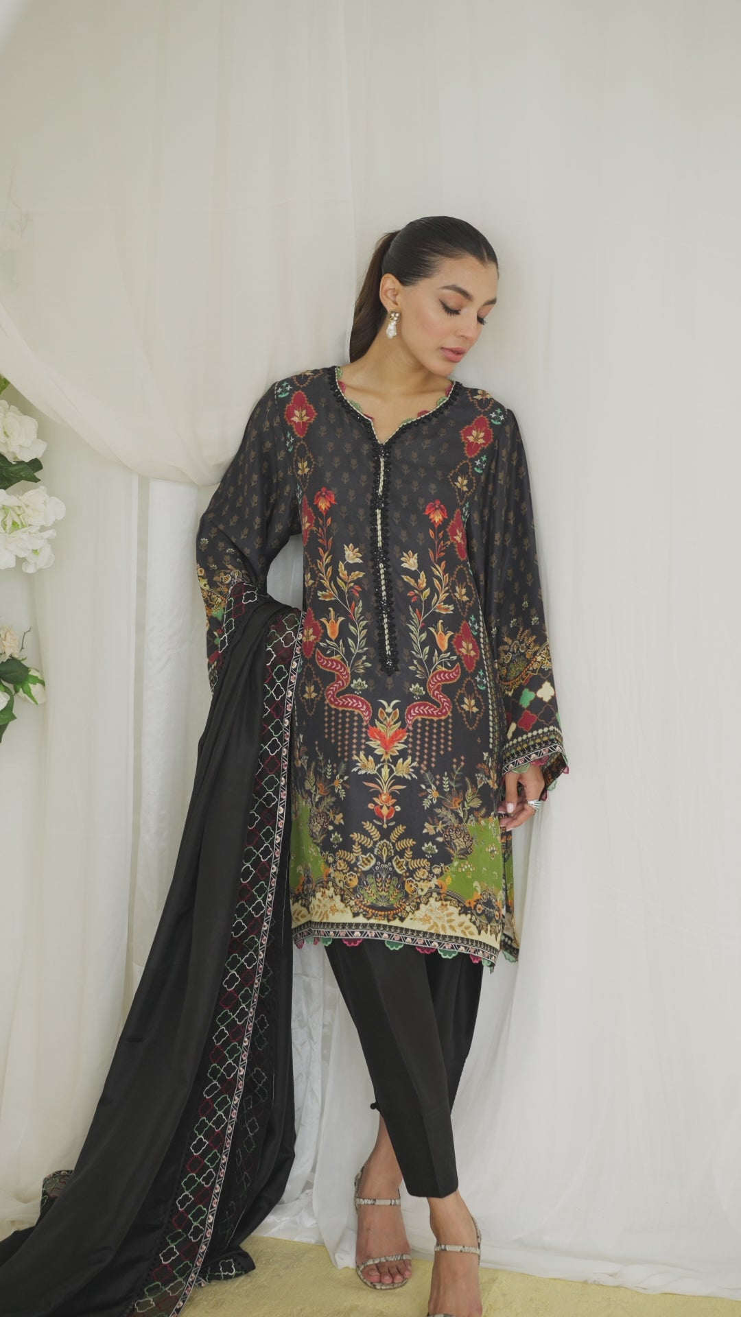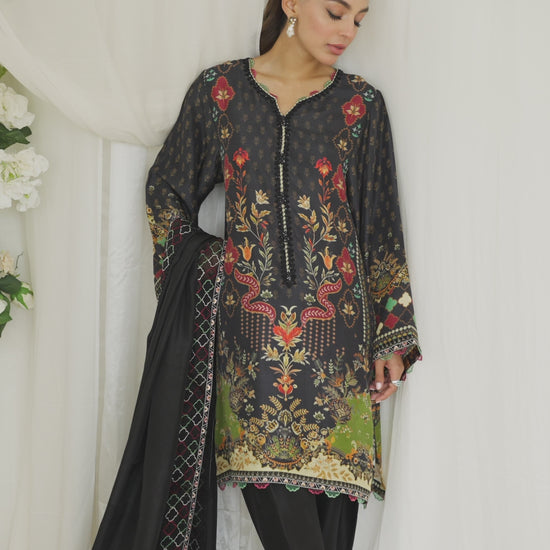 Classic black is given a fresh and glamourous treatment in the Maala ensemble. A deep onyx hue, with eye catching pops of color is further enhanced with intricate hand work all along the neckline.