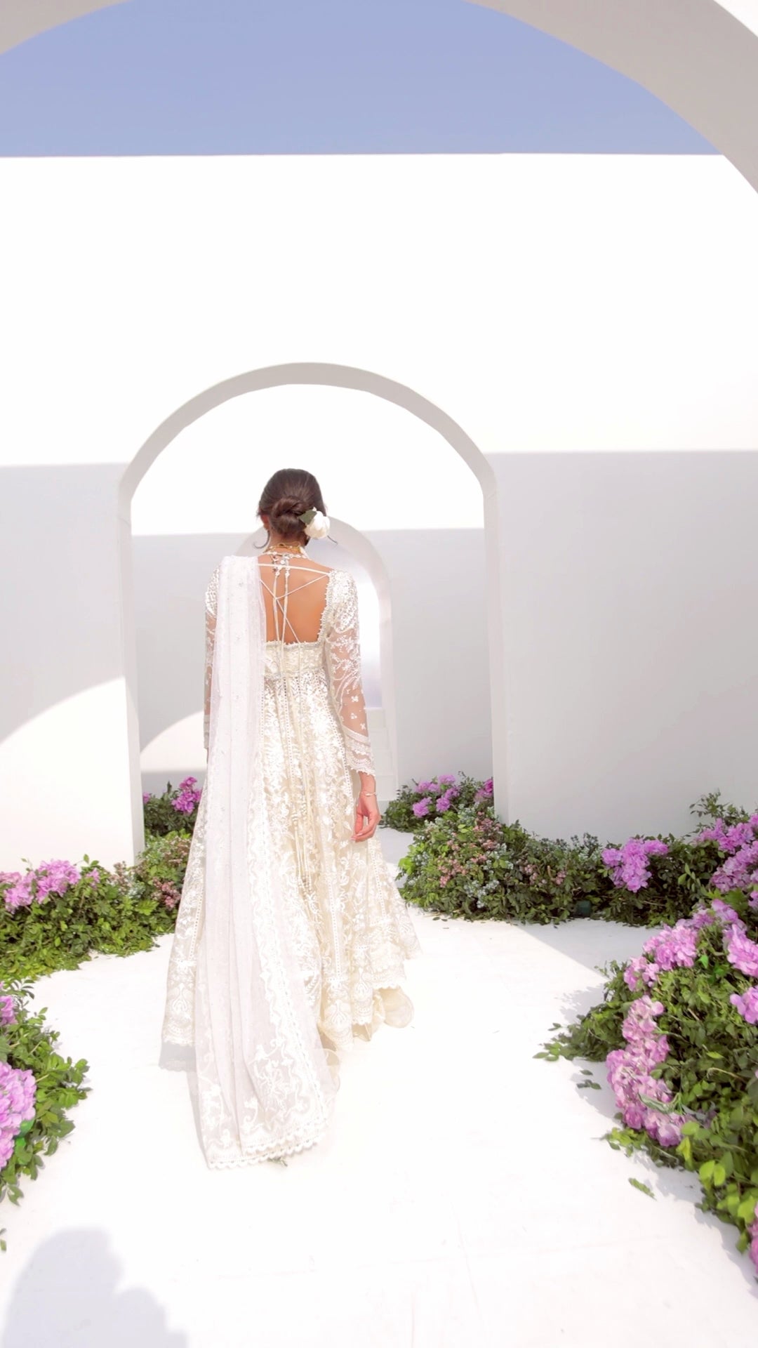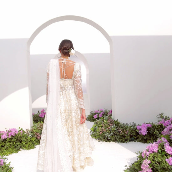 The kalidaar is paired with a delicate tulle dupatta in coordinating ivory with embroidered borders to give the outfit a stunning flair.