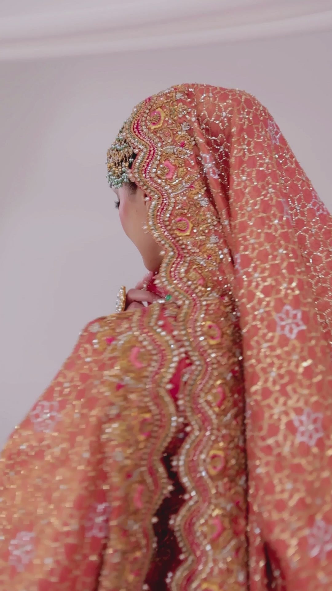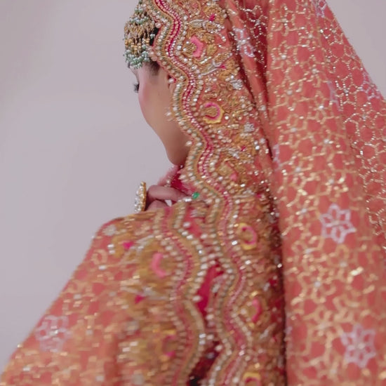 Celebrate the momentous occasion with "Maisha," a bridal ensemble that embodies refined elegance with a touch of modern flair. This captivating outfit features a long, front-open kalidaar shirt in a stunning coral shade, its silhouette exuding timeless beauty. Panels made of pure gold zari that are meticulously adorned with kamdani and kora embroidery, shimmer across the bodice, whispering stories of heritage. Each stitch is a testament to generations of artistry.