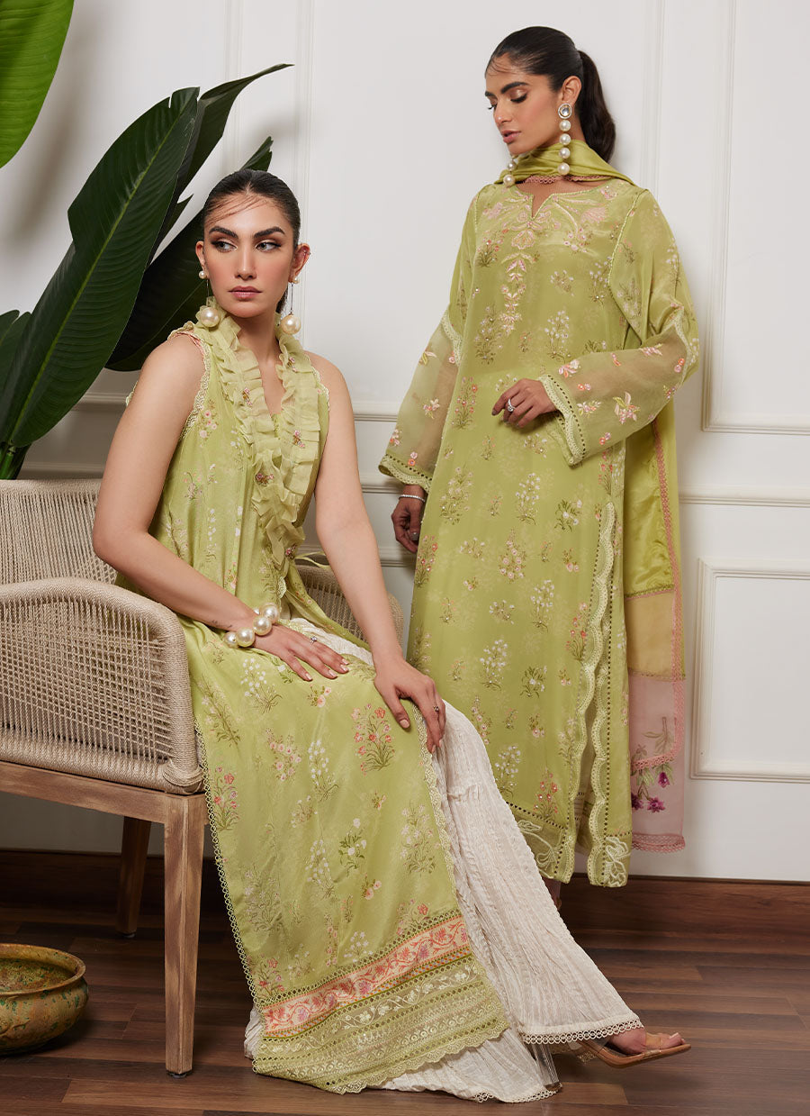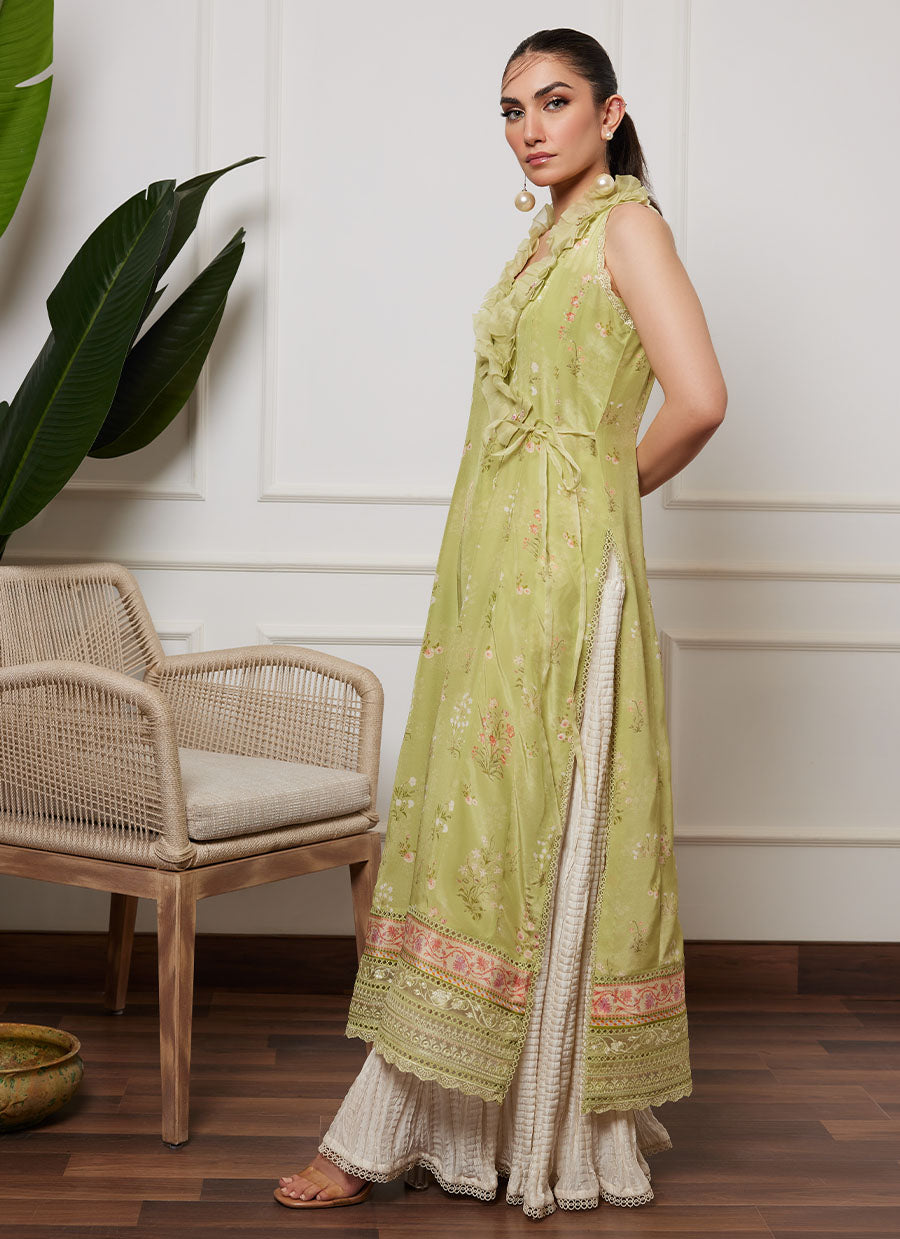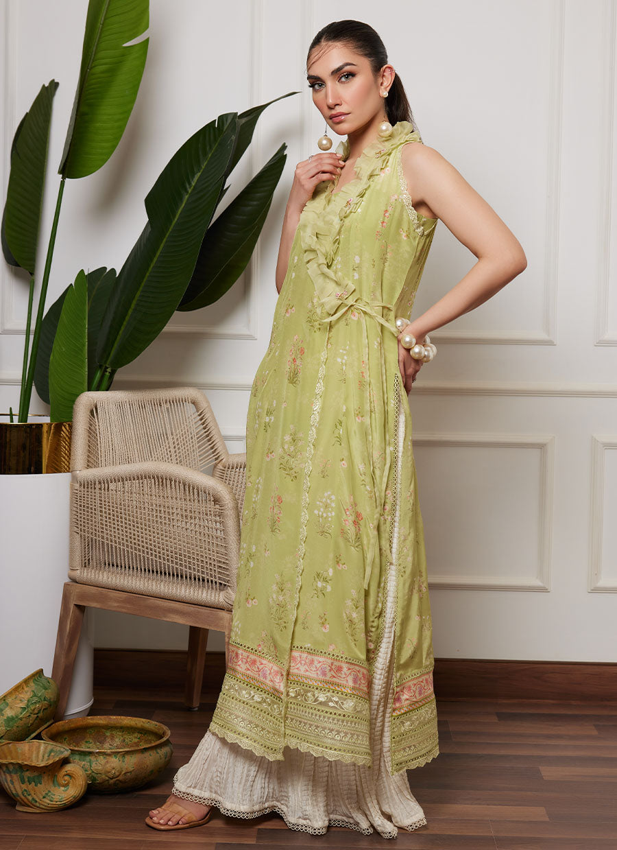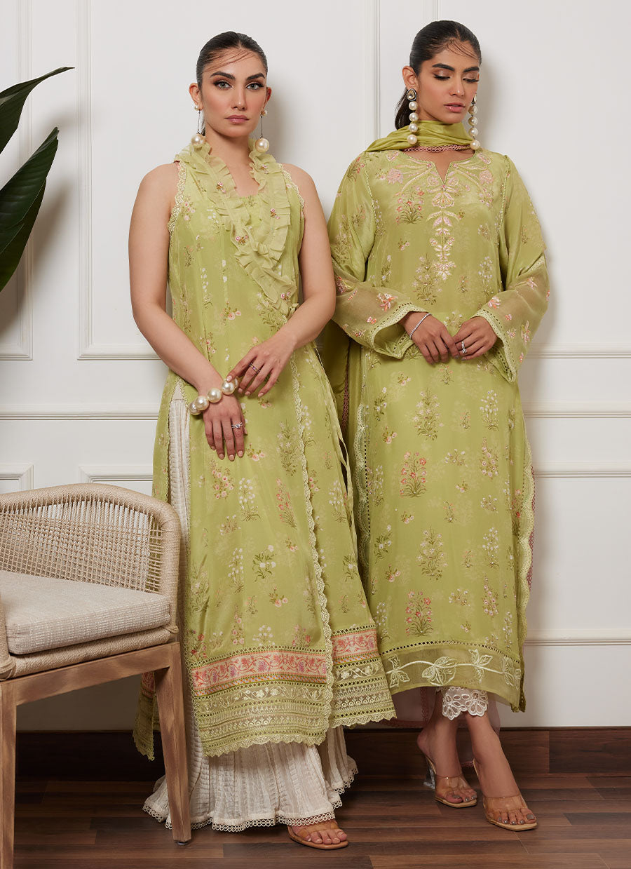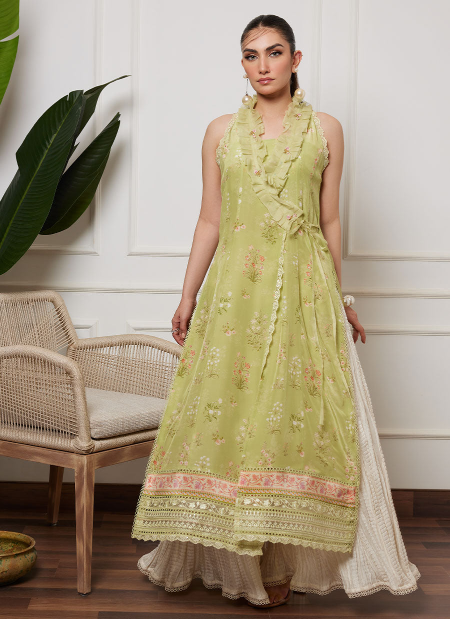A canvas of refreshing kiwi green crepe silk, is printed with uplifting florals in ivory and eye-catching shades of pastel pink and purple.