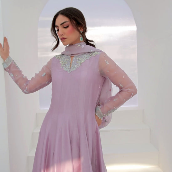 A divine shade of lilac raw silk is adorned with delicate neckline hand-worked with floral motifs, brought to life with shimmering silver and pearls.