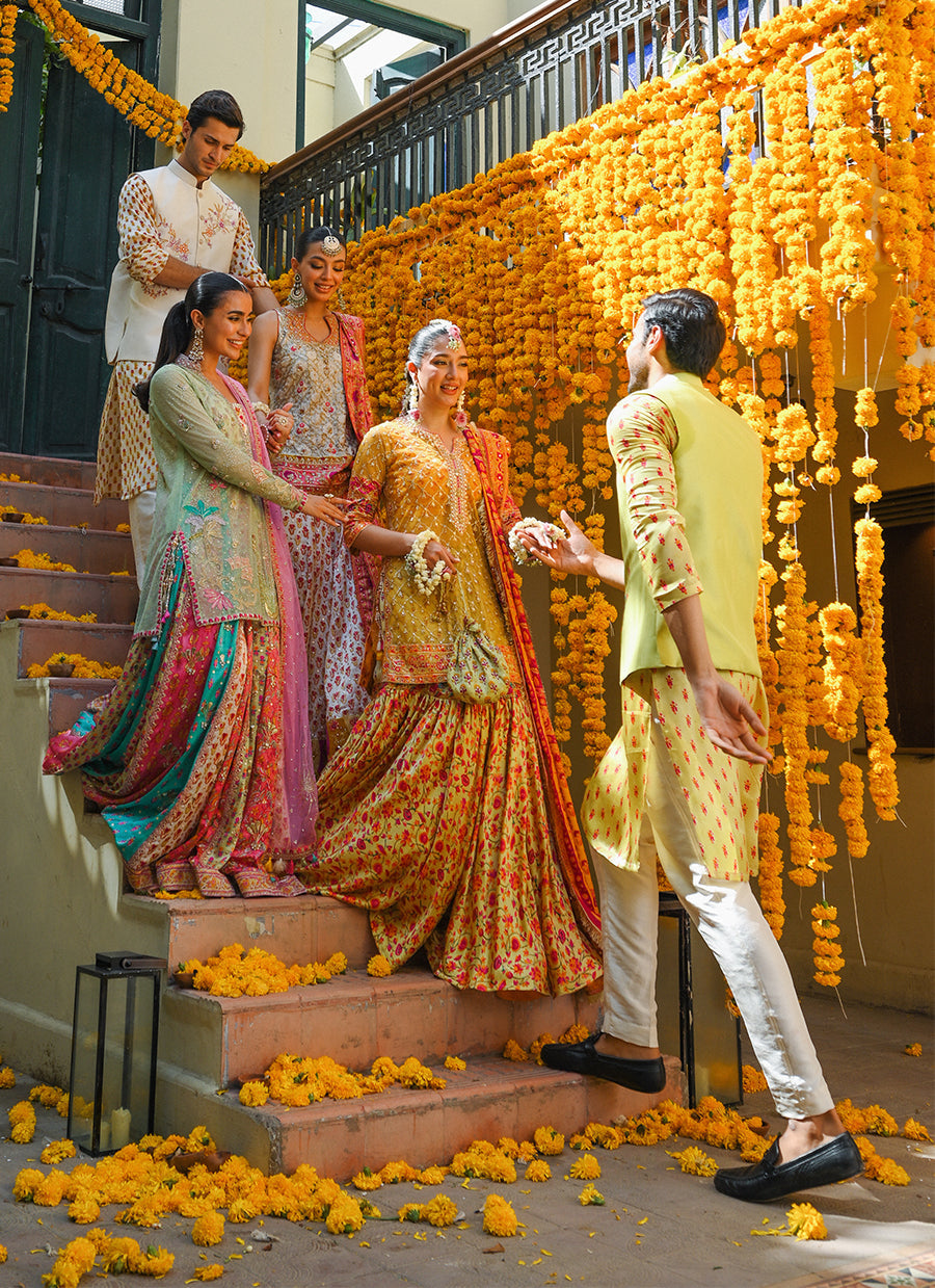 The most beautiful outfit an incredibly different, fun and flattering silhouette. A beautiful soft pastel hues and intricate detailing. The lengha features embroidery, hand embellishments adds oomph with sine and extra sparkle. The shirt is adorned with intricate thread work, gota work, kora, dabka, and sitara, showcasing traditional craftsmanship and intricate detailing. Completing the ensemble is a pink net dupatta embellished with sitara chann all over, lending a subtle shimmer and enhancing its ethereal appeal. The dupatta is adorned with an embroidered border on all four sides, showcasing meticulous craftsmanship. Tassel finishing’s on the corners of the dupatta add a playful and festive touch, completing the look with grace and sophistication. This ensemble is perfect for celebratory occasions, where its blend of pastel colors, intricate embellishments, and traditional design elements create a timeless and captivating aesthetic, making it an ideal choice for special events.