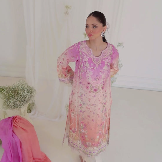 Infused with the signature FTA aesthetic, our new prints have the perfect pastel hues to make your heart skip a beat!! Cut from sumptuous raw silk, the shirt is given a striking ombre treatment, with a gorgeous petal pink that flows seamlessly into an irresistible peachy tone. Whimsical florals bloom daintily all over the shirt, making this an absolute must have. The relaxed, much loved silhouette has a universally flattering neckline, adorned with delicate hand-made floral motifs, pearls and sequins, add an easy timeless elegance. A coordinating pure medium silk dupatta, in peach and pink brings the look together with graceful flair. Pair yours with our embroidered cutwork pants as shown