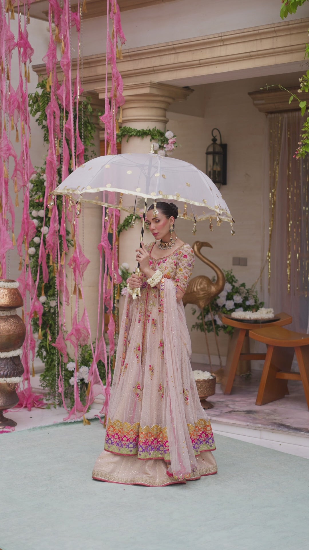 This ensemble is intricately hand-crafted from pure Nude net, brought to life with thread work in shades of pink, purple, orange and green on the bodice and borders. The traditional gota and sitara work mixed with intricate Swarovski crystals and zardozi bring the outfit to life.