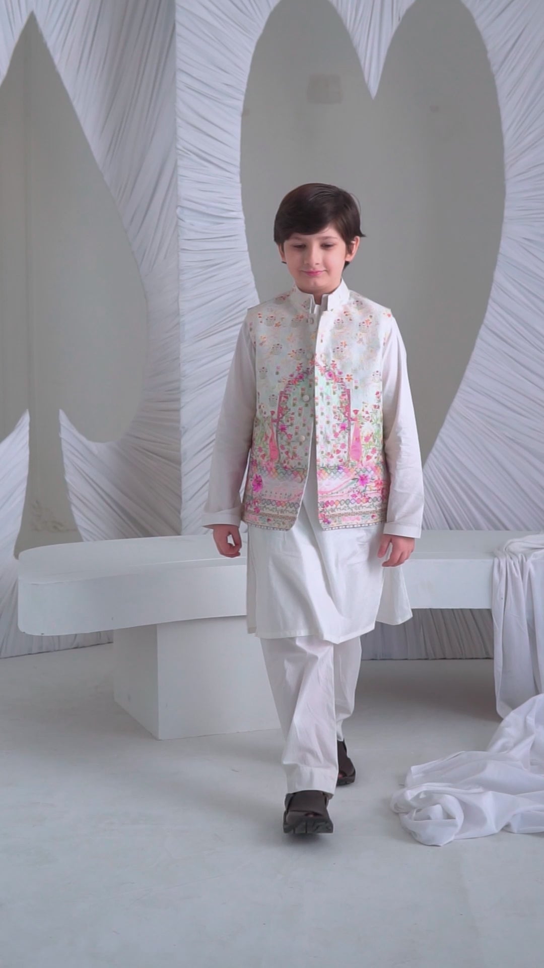 Cut from sumptuous raw silk, the waistcoat is printed with whimsical florals that bloom daintily all over the waistcoat, making this an absolute must-have. The graceful, relaxed-fit waistcoat is paired with a plain Shalwar Kameez; this waistcoat brings an elevated touch to any young boy's wardrobe, combining timeless elegance with youthful charm.