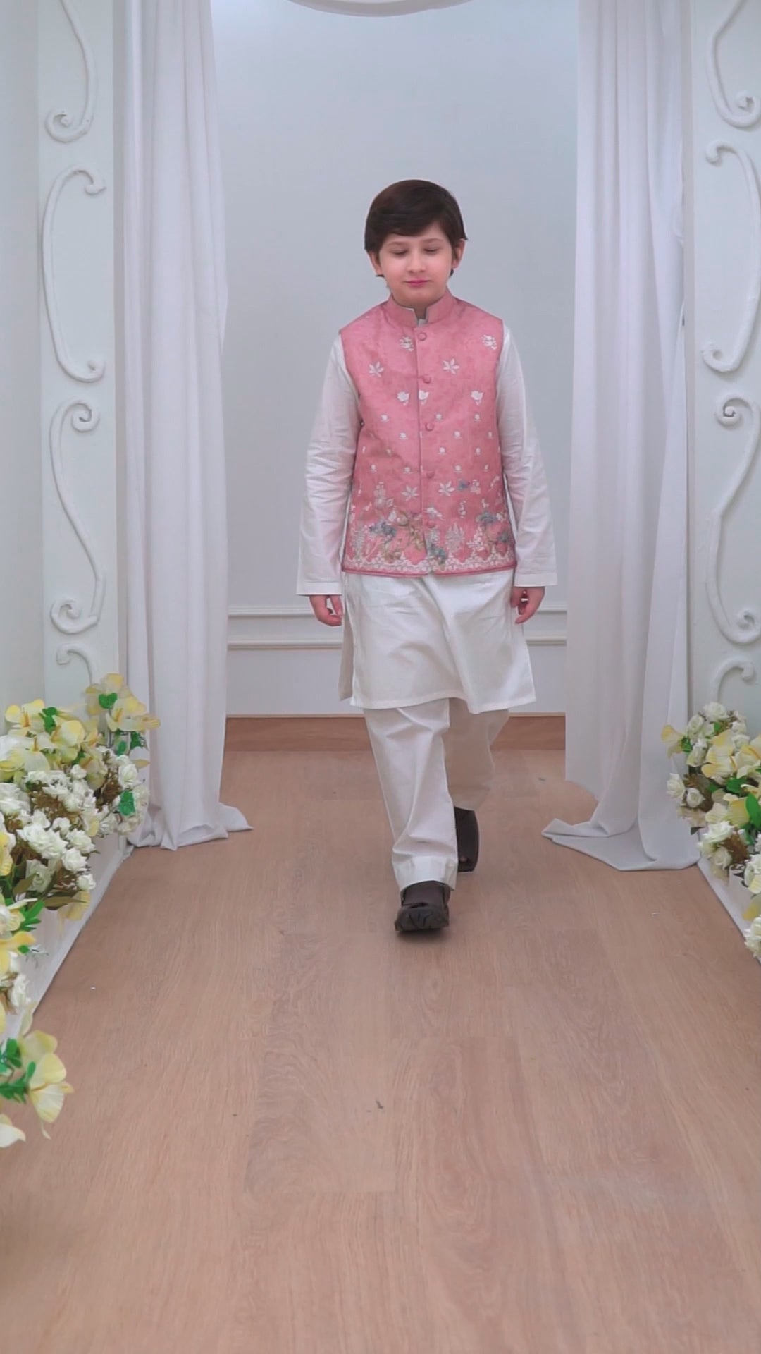 This chai pink soft floral printed raw silk waistcoat for a young boy offers a refined yet playful look, perfect for special occasions. The gentle chai pink hue, paired with a delicate floral print, brings a soft, sophisticated charm to the design. The raw silk fabric is both luxurious and comfortable, with a subtle sheen that adds to its elegant appeal. Tailored to perfection, the waistcoat features a sleek fit, with fine button fastenings and neat stitching details, ensuring a polished appearance. Ideal for pairing with an ivory kurta and shalwar, this waistcoat brings a touch of youthful refinement to any young boy’s wardrobe, offering a perfect balance of traditional style and modern flair.
