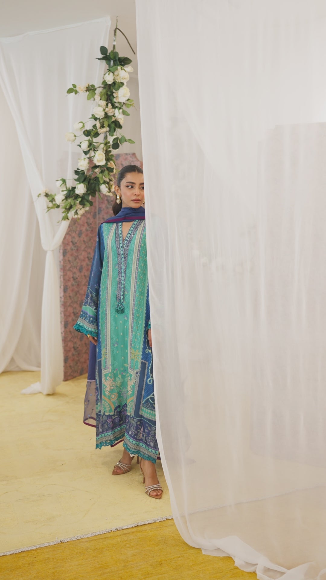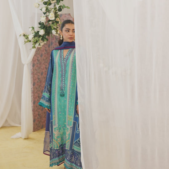 The captivating colour palette of this outfit makes it your ultimate solution to all occasions, big or small. Cut from pure raw silk boasting a luxurious fall the vibrant emerald green and lapis blue printed shirt is adorned with embroidery on the neckline and sleeves. The pure medium silk dupatta edged with organza makes this an inevitable show stopper. Pair with our pure raw silk izaar pants as shown for an unforgettable look!