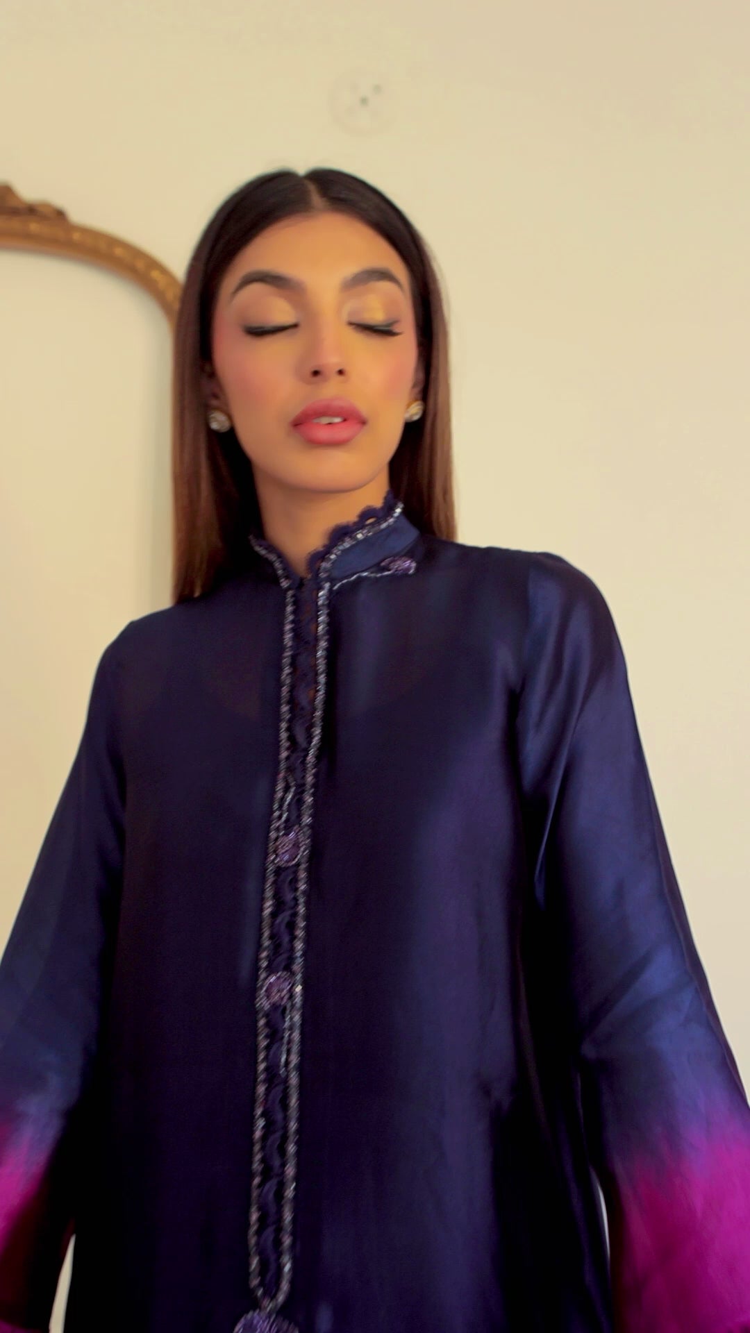 This ultra-flowy two-toned creation is the ideal choice to spring festivities as it comes in an ombre color that is to die for. The elegant loose-fit shisha silk long shirt is a beautiful collared long neckline with exquisite hand embellishment of pearls and sequences that adds just the shine needed to bring that summer bling. The ensemble that effortlessly flows from royal blue to deep rich magenta is embellished with floral motifs and comes with schiffli borders with lace detailing in contrasting color at the sleeves and hem. This look is paired with purple raw silk long loose pants and represents a woman who is daring enough to be in her element.