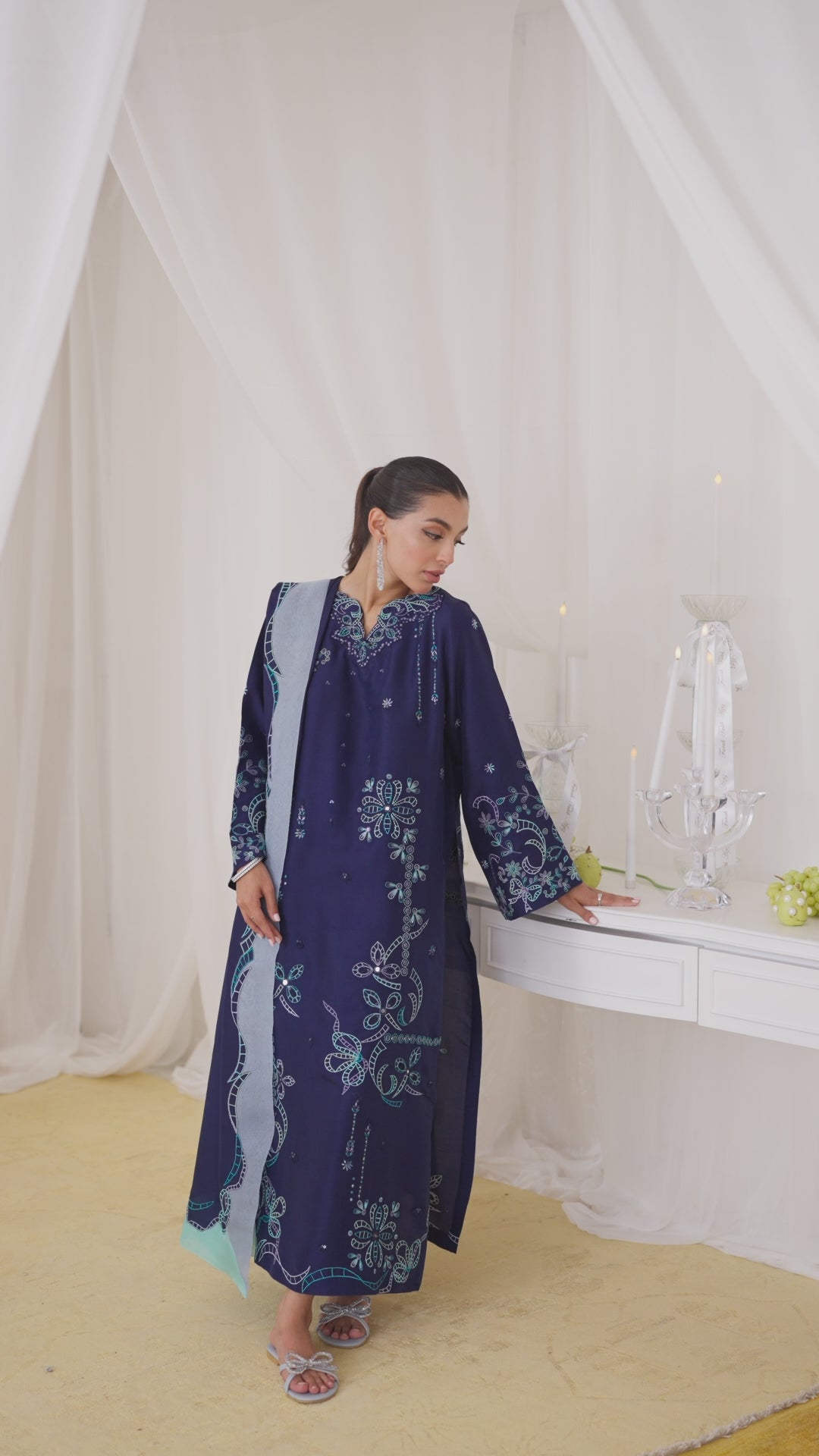 The ultimate year-round closet staple Nada Ink Blue is your obvious choice for a style reset. Cut from sumptuous, pure raw silk the elegant long shirt is adorned with contemporary motifs in refreshing cool tones. The pure medium silk dupatta with embroidery and wide organza borders adds a touch of pure grace to your ensemble. Style yours with our matching pure raw silk pants and some sparkly earrings for a crisp, timelessly chic look.