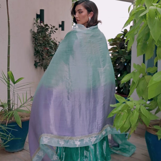 The Naja ensemble one of those absolute must have ensembles. The round universally flattering neckline has an enticing mix of stunning silver and light gold hand work. The long, flowing kalidaar is tapered at the waist and cinched with an exclusively hand-crafted belt is the perfect silhouette for your winter wedding wardrobe. To complete the look, the outfit has a beautiful two toned aqua and lavender, tissue silk dupatta with embroidered borders.